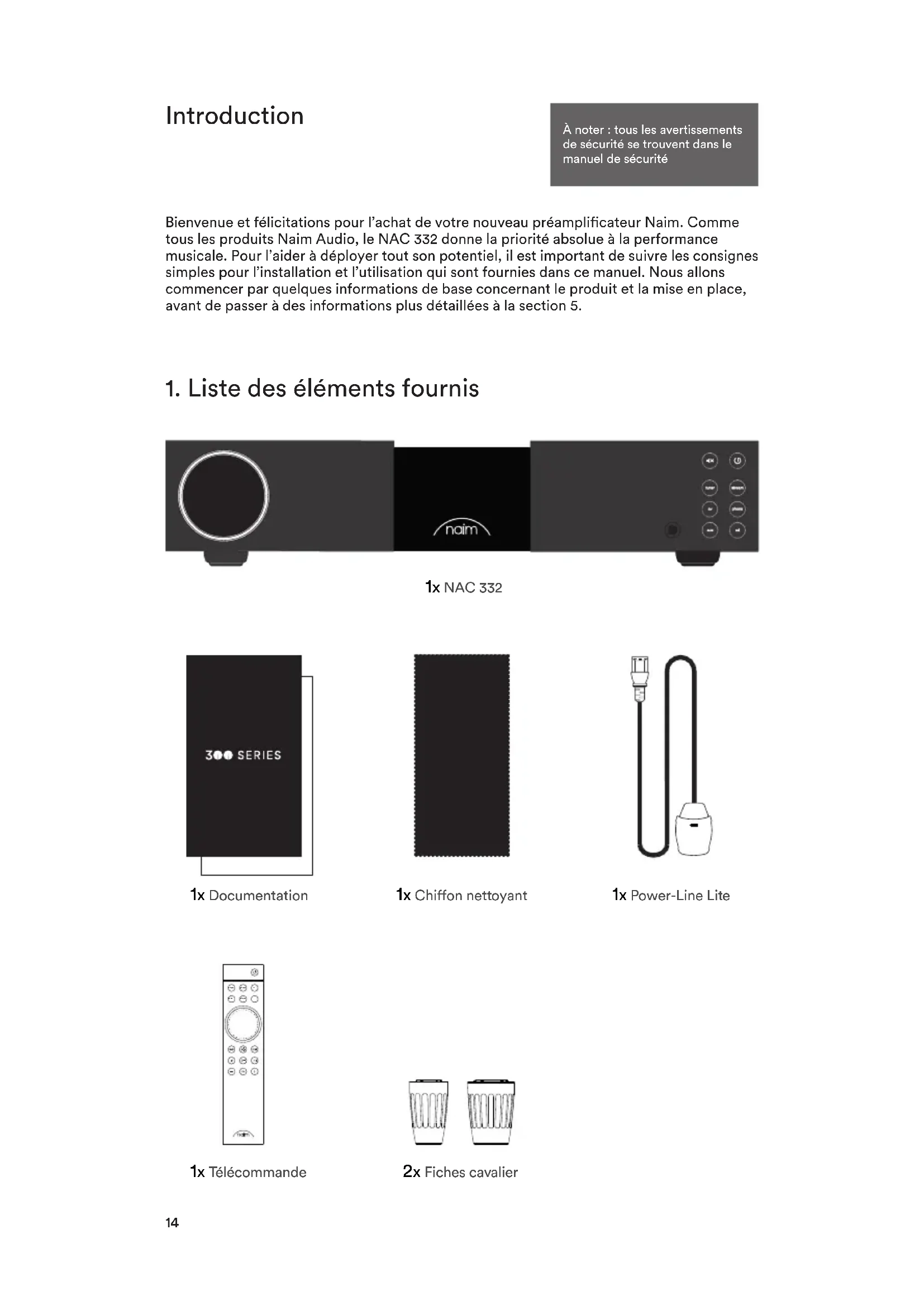 Bienvenue et félicitations pour l’achat de votre nouveau préamplicateur Naim. Comme tous les produits Naim Audio, le NAC 332 donne la priorité absolue à la performance musicale. Pour l’aider à déployer tout son potentiel, il est important de suivre les consignes simples pour l’installation et l’utilisation qui sont fournies dans ce manuel. Nous allons commencer par quelques informations de base concernant le produit et la mise en place, avant de passer à des informations plus détaillées à la section 5. Introduction