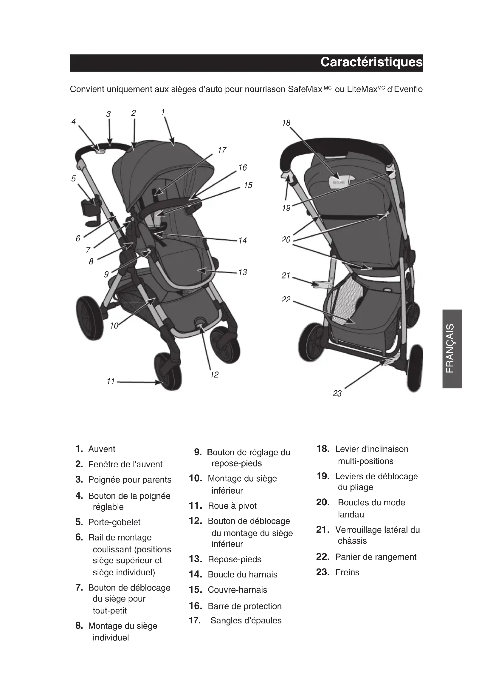 d'Evenflo avec cette poussette. Les autres sièges d'auto pour nourrisson ou porte-bébés ne sont pas conçus pour s'ajuster au châssis de la poussette, sauf si spécifié dans les instructions. Tous les sièges d'auto utilisés avec cette poussette qui ne sont pas spécifiés dans les instructions peuvent être source de blessures graves pour l'enfant.