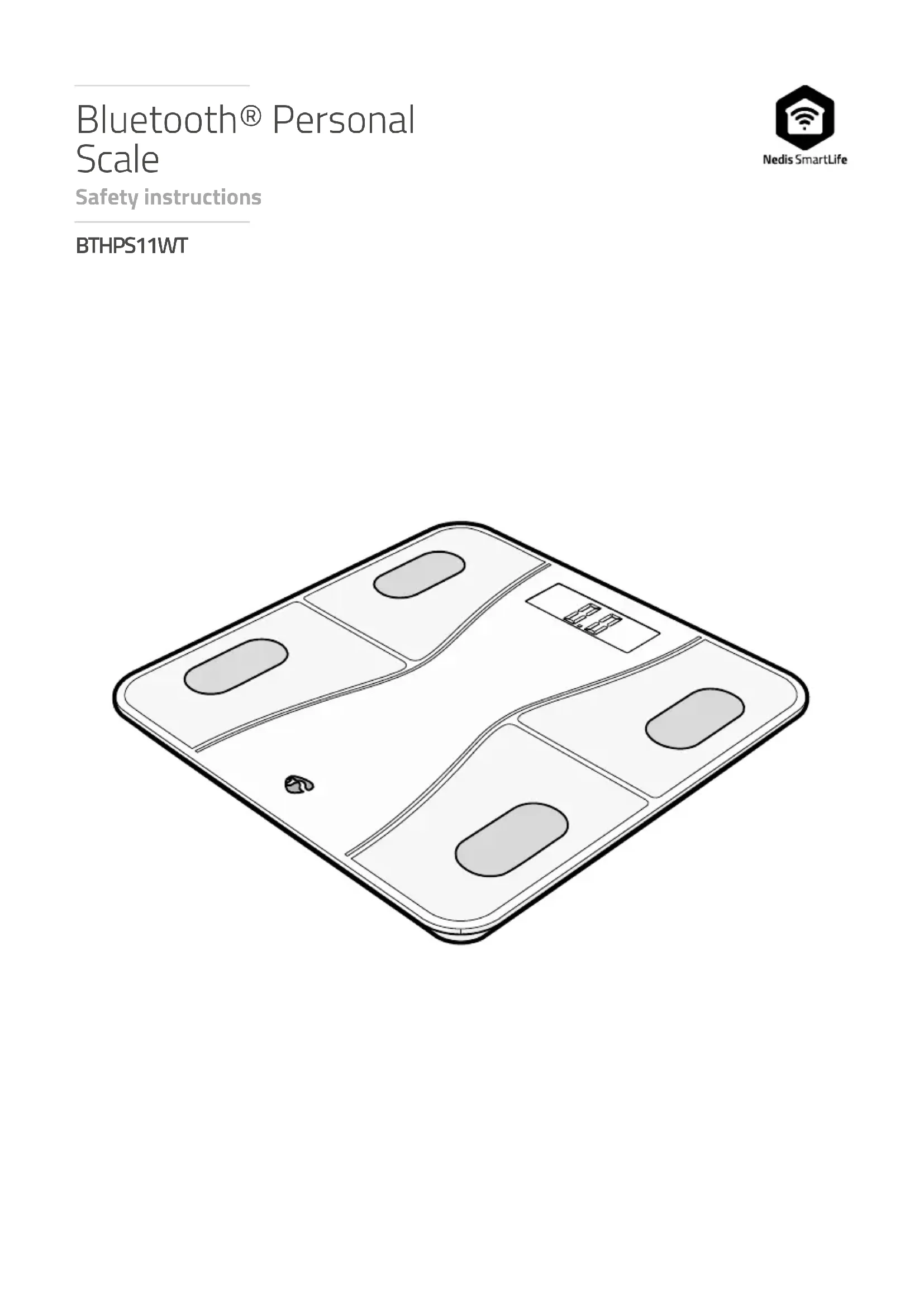 Veiligheidsvoorschriften Personenweegschaal met Bluetooth® BTHPS11WT Zie voor meer informatie de uitgebreide handleiding online: ned.is/bthps11wt Over dit document Dit document is de gebruikershandleiding en bevat alle informatie voor correct, eciënt en veilig gebruik van het product. Zorg ervoor dat u de instructies in dit document volledig gelezen en begrepen heeft voordat u het product installeert of gebruikt. Bewaar de verpakking en dit document voor toekomstig gebruik. Gebruikte symbolen WAARSCHUWING! Signaalwoord dat gebruikt wordt om een mogelijk gevaarlijke situatie aan te geven die, indien deze niet vermeden wordt, kan leiden tot de dood of ernstig letsel. Symboles utilisés AVERTISSEMENT! Terme de signalement utilisé pour indiquer une situation potentiellement dangereuse qui, si elle n’est pas évitée, pourrait entraîner la mort ou des blessures graves. AVIS Terme de signalement utilisé pour désigner des pratiques non liées à des blessures physiques. Utilisation prévue Ce produit est conçu comme une balance pour mesurer et suivre votre poids. La balance peut calculer le pourcentage de graisse corporelle et le pourcentage d’hydratation en fonction de paramètres dénis tels que le sexe, la taille et l’âge. Ce produit est destiné à être utilisé avec l’application Nedis SmartLife. Ce produit est prévu pour un usage intérieur uniquement. Ce produit est destiné à être utilisé dans des applications domestiques et similaires telles que des cuisines. Ce produit n’est pas destiné à un usage professionnel. Consignes de sécurité Assurez-vous d'avoir entièrement lu et compris les instructions de ce document avant d'installer ou d'utiliser le produit. Conservez l'emballage et le présent document pour référence ultérieure. AVERTISSEMENT! Danger électrique :