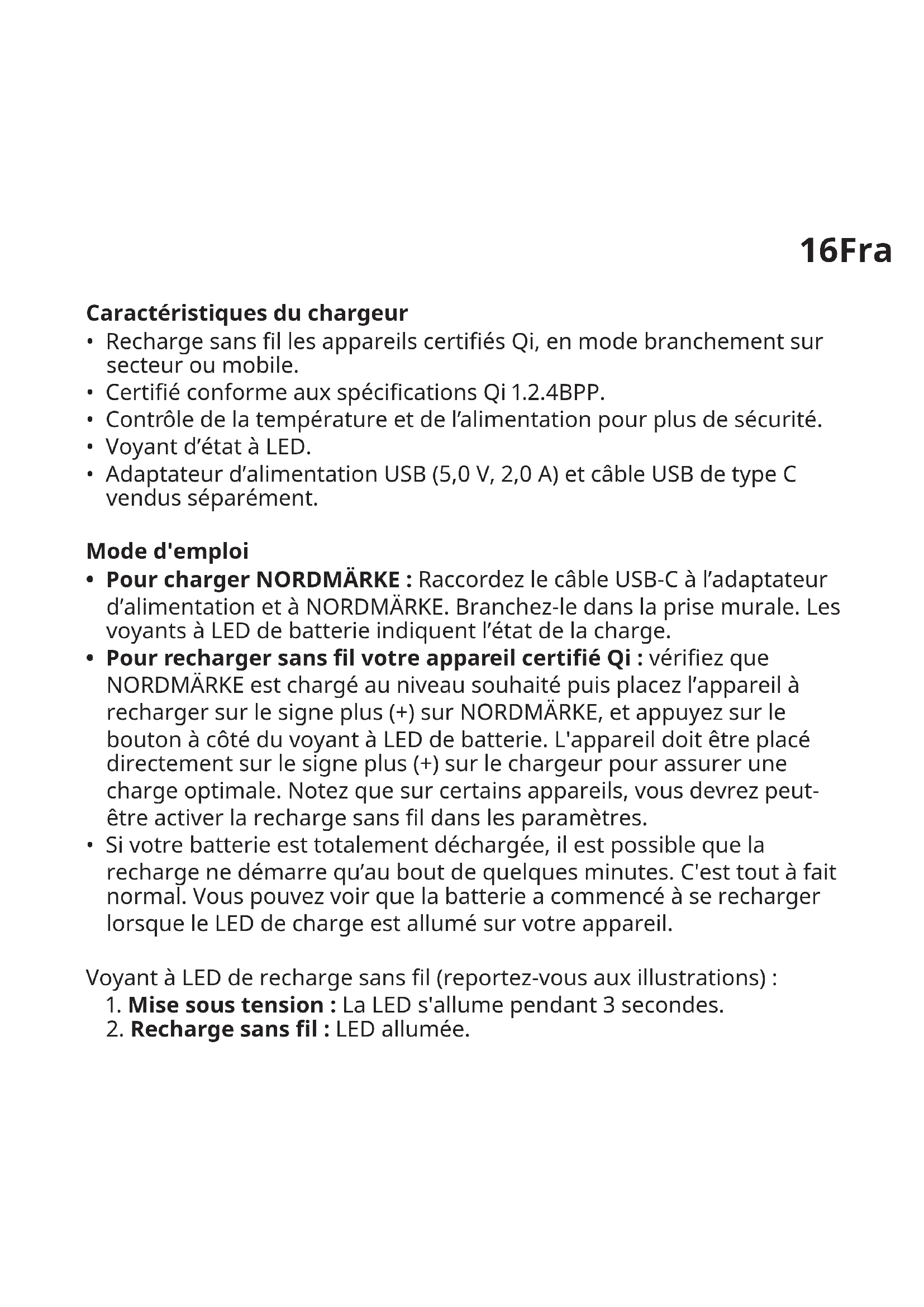 - PourrechargersanslvotreappareilcertiéQi: vériez que NORDMÄRKE est chargé au niveau souhaité puis placez l’appareil à recharger sur le signe plus (+) sur NORDMÄRKE, et appuyez sur le bouton à côté du voyant à LED de batterie. L'appareil doit être placé directement sur le signe plus (+) sur le chargeur pour assurer une charge optimale. Notez que sur certains appareils, vous devrez peut- être activer la recharge sans l dans les paramètres.