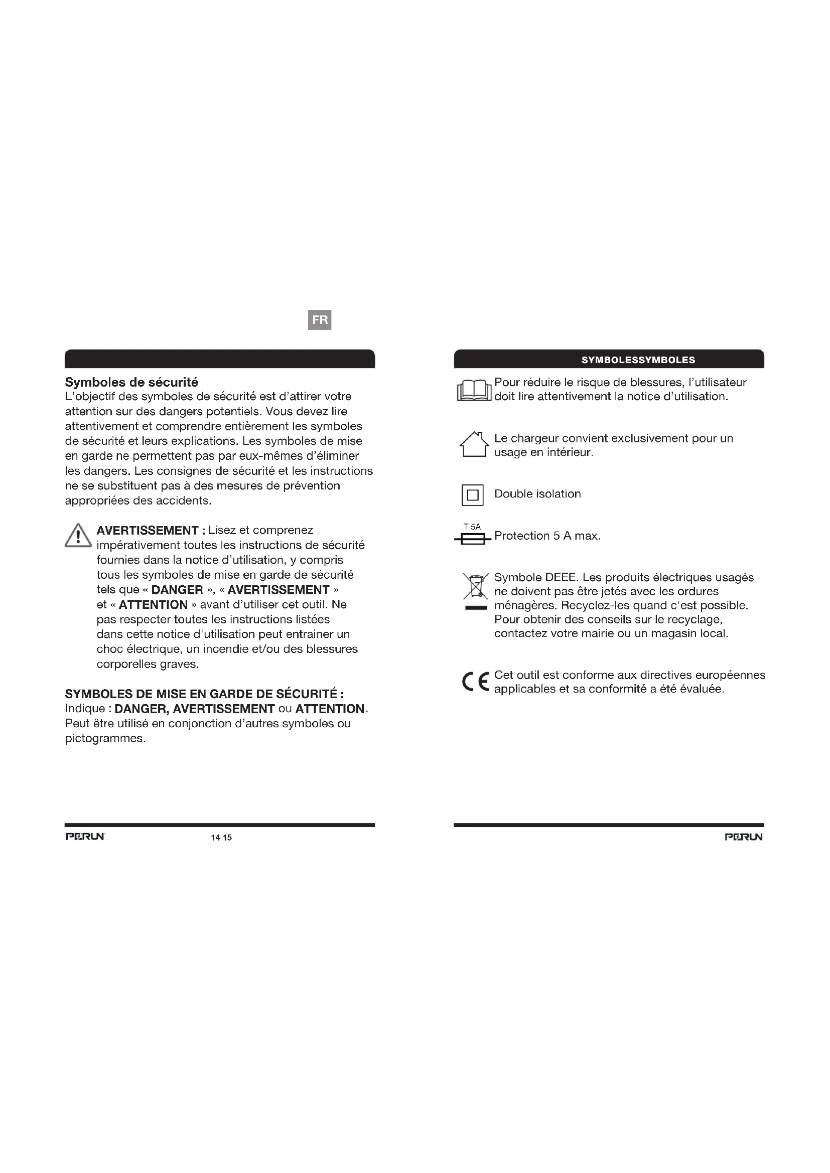 Pour réduire le risque de blessures, l’utilisateur doit lire attentivement la notice d’utilisation. Le chargeur convient exclusivement pour un usage en intérieur. Double isolation Protection 5 A max. Symbole DEEE. Les produits électriques usagés ne doivent pas être jetés avec les ordures ménagères. Recyclez-les quand c'est possible. Pour obtenir des conseils sur le recyclage, contactez votre mairie ou un magasin local. Cet outil est conforme aux directives européennes applicables et sa conformité a été évaluée. SYMBOLESSYMBOLES Symboles de sécurité L’objectif des symboles de sécurité est d’attirer votre attention sur des dangers potentiels. Vous devez lire attentivement et comprendre entièrement les symboles de sécurité et leurs explications. Les symboles de mise en garde ne permettent pas par eux-mêmes d’éliminer les dangers. Les consignes de sécurité et les instructions ne se substituent pas à des mesures de prévention appropriées des accidents.