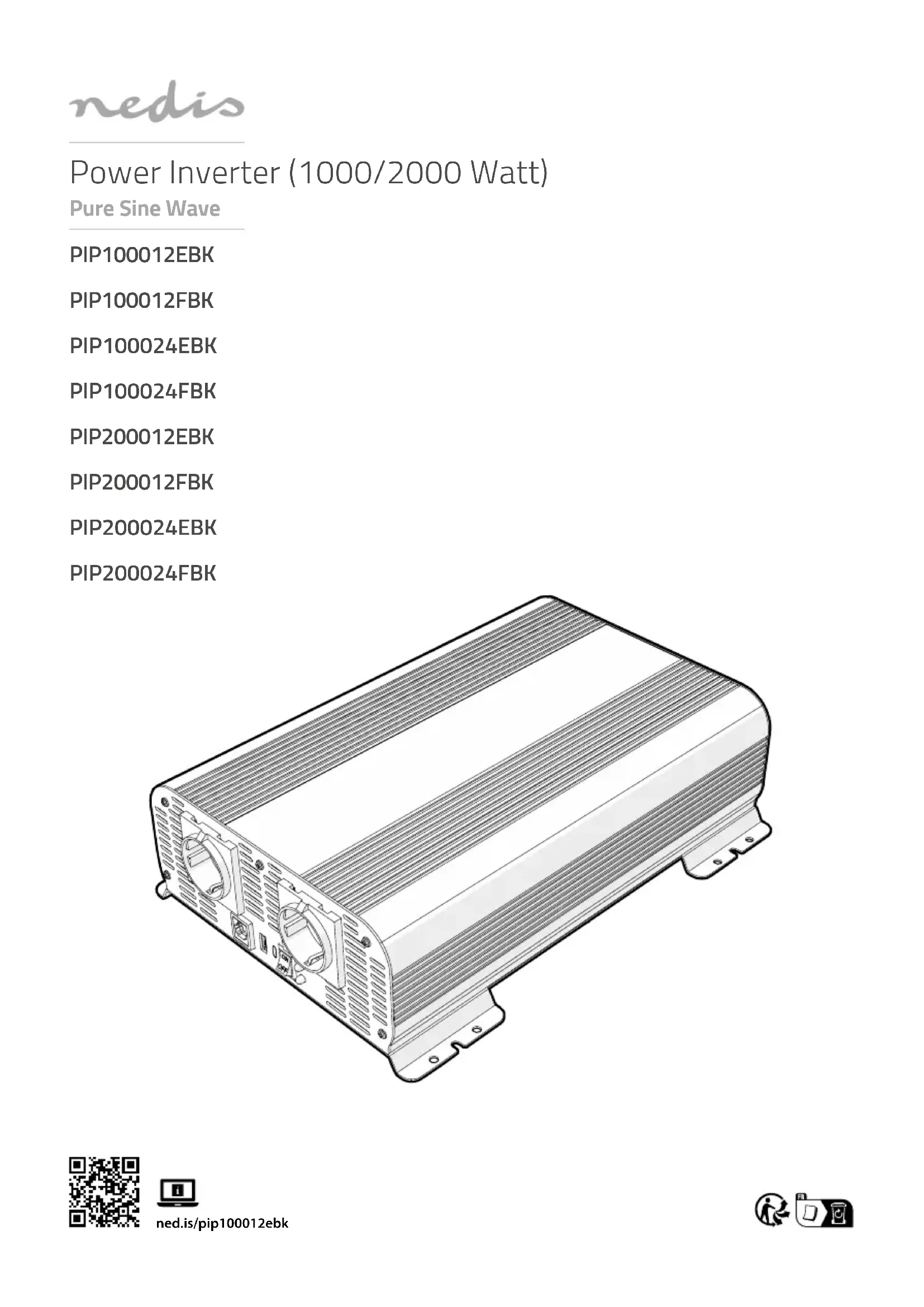 Guide de démarrage rapide Onduleur de puissance (1000/2000 Watt) PIP100012EBK PIP100012FBK PIP100024EBK PIP100024FBK PIP200012EBK PIP200012FKB PIP200024EBK PIP200024FBKPour plus d'informations, consultez le manuel détaillé en ligne : ned.is/pip100012ebk Utilisation prévue Ce produit est un convertisseur de puissance qui permet de convertir 12/24 V DC en 230 V AC. Vériez les spécications de votre modèle.N'utilisez ce produit qu'en combinaison avec des appareils de classe II. Ne pas utiliser ce produit avec :• Appareils dépassant la puissance nominale de l'onduleur.• Les appareils à charge capacitive et perceptive tels que les climatiseurs, les perceuses à haute puissance, les réfrigérateurs, les fours à micro-ondes ou les mixeurs.7