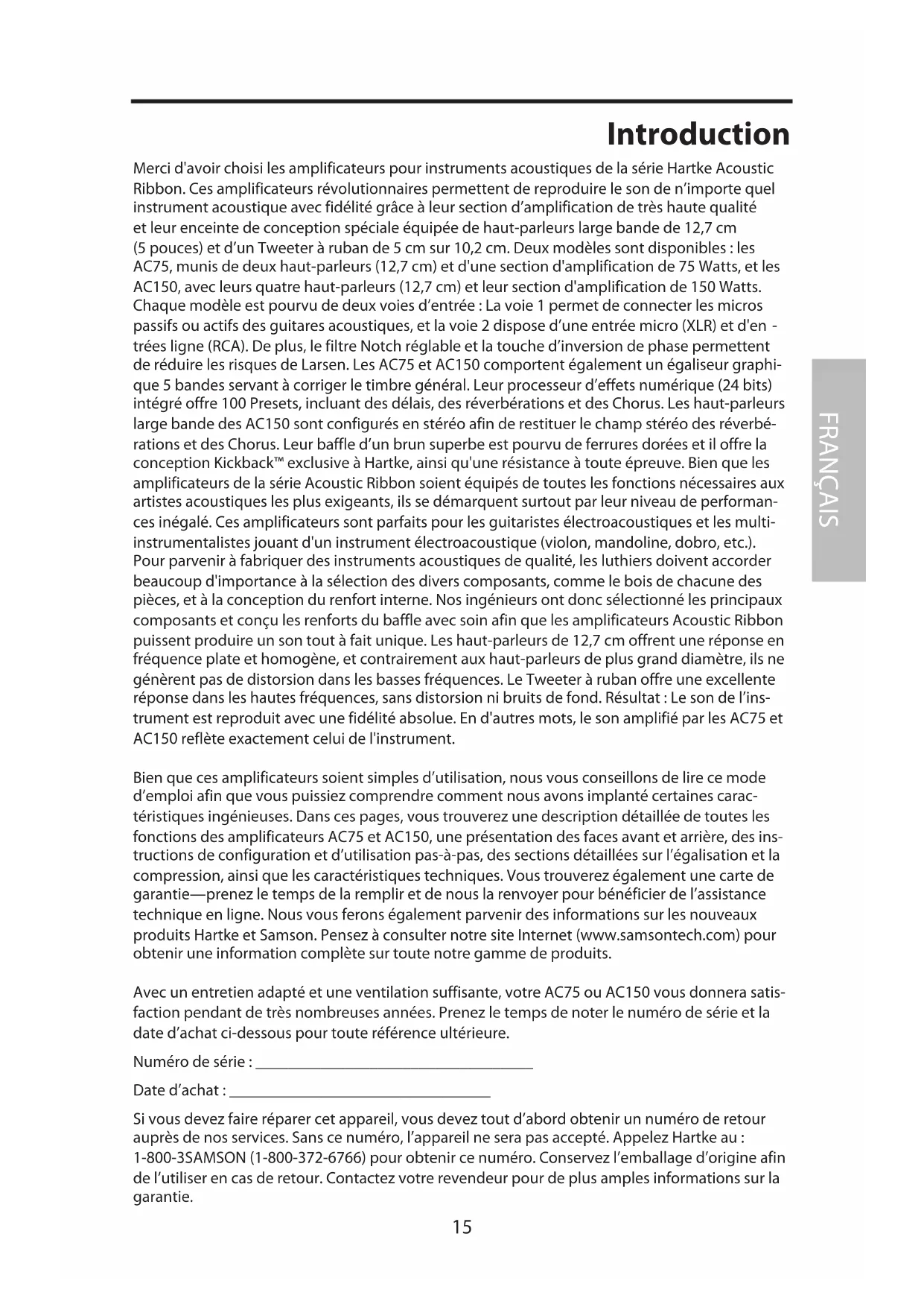 Bien que ces amplificateurs soient simples d'utilisation, nous vous conseillons de dire ce mode d'emploi afin que vous puissiez comprendre comment nous avons implanté certaines caractéristiques ingénieuses. Dans ces pages, vous trouvez une description détaillée de toutes les fonctions des amplificateurs AC75 et AC150, une presentation des faces avant et arrière, des instructions de configuration et d'utilisation pas-à-pas, des sections détaillées sur l'égalisation et la compression, ainsi que les caractéristiques techniques. Vous trouvez également une carte de garantie—prénez le temps de la replir et de nous la renvoyer pour bénéficier de l'assistance technique en ligne. Nous vous ferons également parvenir des informations sur les nouveaux produits Hartke et Samson. Pensez à consulter notre site Internet (www.samsontech.com) pour obtenir une information complète sur toute notre gamme de produits.