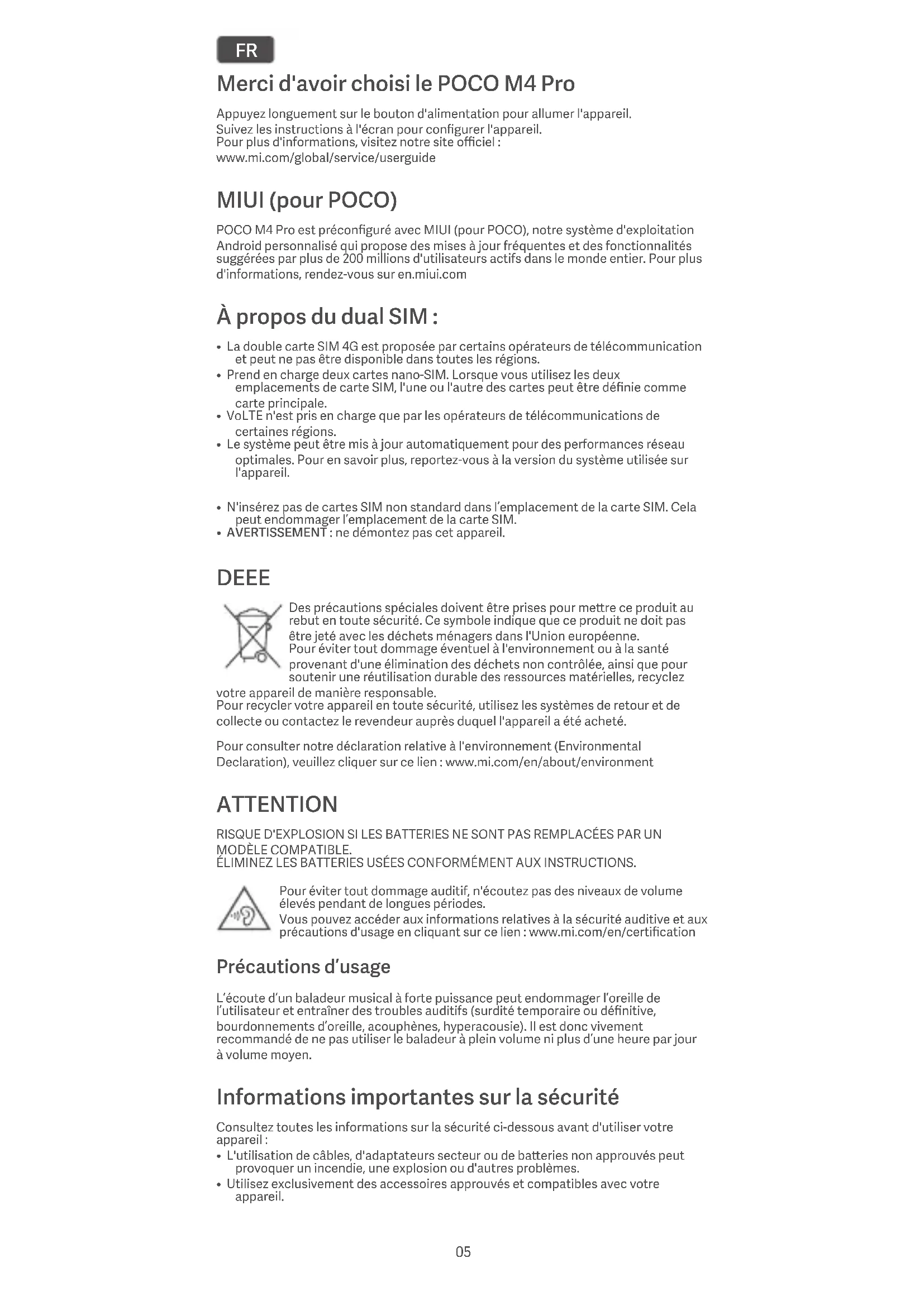 - AVERTISSEMENT : ne démontez pas cet appareil. DEEE Des précautions spéciales doivent être prises pour mere ce produit au rebut en toute sécurité. Ce symbole indique que ce produit ne doit pas être jeté avec les déchets ménagers dans l'Union européenne. Pour éviter tout dommage éventuel à l'environnement ou à la santé provenant d'une élimination des déchets non contrôlée, ainsi que pour soutenir une réutilisation durable des ressources matérielles, recyclez votre appareil de manière responsable. Pour recycler votre appareil en toute sécurité, utilisez les systèmes de retour et de collecte ou contactez le revendeur auprès duquel l'appareil a été acheté. Pour consulter notre déclaration relative à l'environnement (Environmental Declaration), veuillez cliquer sur ce lien : www.mi.com/en/about/environment ATTENTION RISQUE D'EXPLOSION SI LES BATTERIES NE SONT PAS REMPLACÉES PAR UN MODÈLE COMPATIBLE. ÉLIMINEZ LES BATTERIES USÉES CONFORMÉMENT AUX INSTRUCTIONS. Pour éviter tout dommage auditif, n'écoutez pas des niveaux de volume élevés pendant de longues périodes. Vous pouvez accéder aux informations relatives à la sécurité auditive et aux précautions d'usage en cliquant sur ce lien : www.mi.com/en/certification Précautions d’usage L’écoute d’un baladeur musical à forte puissance peut endommager l’oreille de l’utilisateur et entraîner des troubles auditifs (surdité temporaire ou définitive, bourdonnements d’oreille, acouphènes, hyperacousie). Il est donc vivement recommandé de ne pas utiliser le baladeur à plein volume ni plus d’une heure par jour à volume moyen. Informations importantes sur la sécurité Consultez toutes les informations sur la sécurité ci-dessous avant d'utiliser votre appareil :