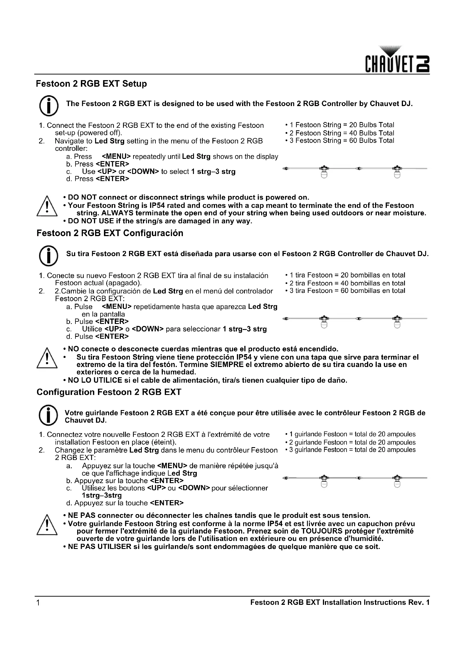 - NO LO UTILICE si el cable de alimentación, tira/s tienen cualquier tipo de daño. Configuration Festoon 2 RGB EXT Votre guirlande Festoon 2 RGB EXT a été conçue pour être utilisée avec le contrôleur Festoon 2 RGB de Chauvet DJ.
