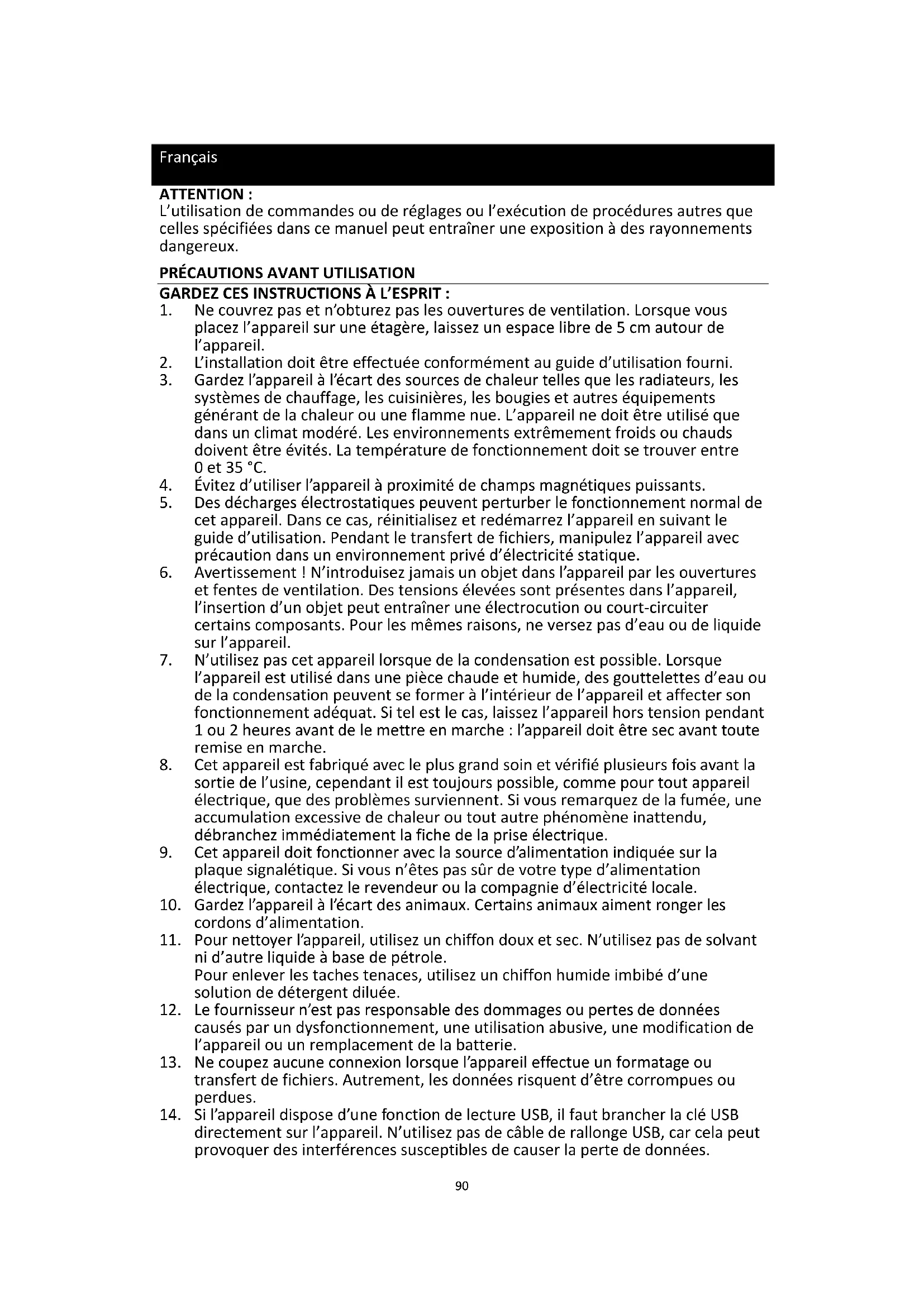 directement sur l’appareil. N’utilisez pas de câble de rallonge USB, car cela peut provoquer des interférences susceptibles de causer la perte de données.91