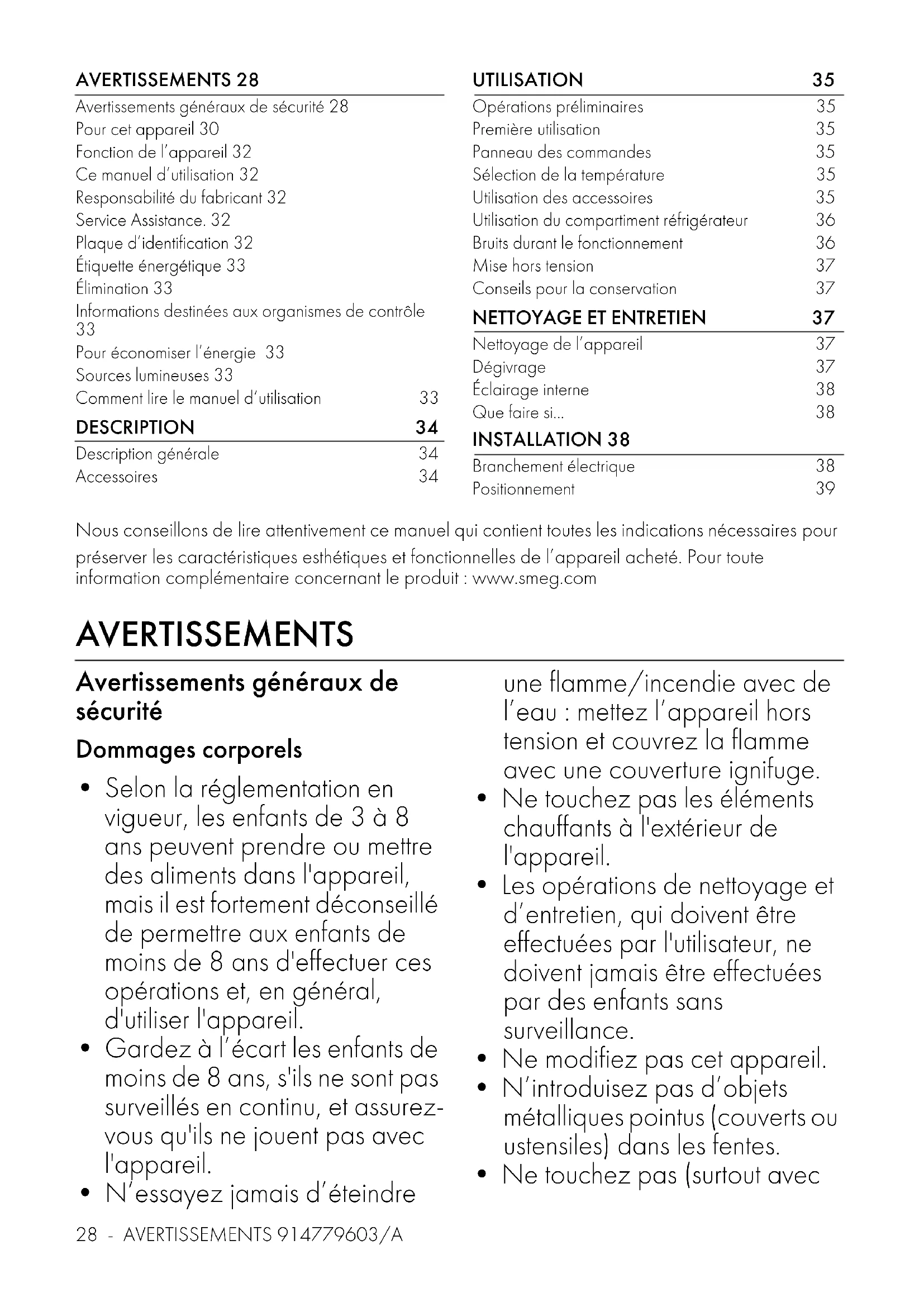 Nettoyage de l’appareil 37 Dégivrage 37 Éclairage interne 38 Que faire si... 38 INSTALLATION 38 Branchement électrique 38 Positionnement 39 Nous conseillons de lire attentivement ce manuel qui contient toutes les indications nécessaires pour préserver les caractéristiques esthétiques et fonctionnelles de l’appareil acheté. Pour toute information complémentaire concernant le produit : www.smeg.com AVERTISSEMENTS Avertissements généraux de sécurité Dommages corporels