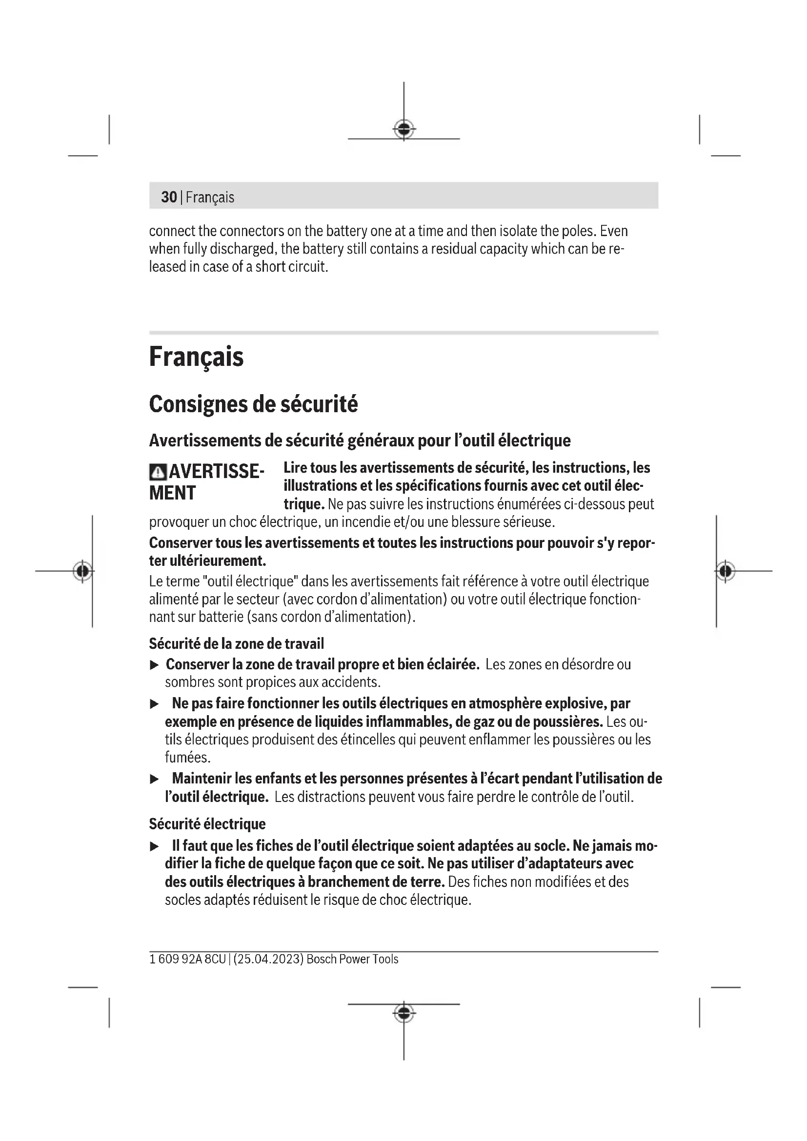 Spray the surface to be cleaned directly with a spray cleaner. – First position the power tool on the surface to be cleaned and then switch on the power tool. This prevents spray. – Move the power tool slowly, in a circular motion and without exerting pressure on the surface to be cleaned. Temperature-dependent overload protection In normal conditions of use, the power tool cannot be overloaded. If the power tool is overloaded or the permitted battery temperature is exceeded, the electronics of the power tool will switch off until the temperature returns to within the optimum operating temperature range. Bosch Power Tools 1 609 92A 8CU | (25.04.2023)28 | English Maintenance and Service Maintenance and Cleaning u To ensure safe and efficient operation, always keep the power tool and the vent- ilation slots clean. If the battery is no longer working, please contact an authorised after-sales service agent for Bosch power tools. In order to avoid safety hazards, if the power supply cord needs to be replaced, this must be done by Bosch or by an after-sales service centre that is authorised to repair Bosch power tools. – Do not immerse the power tool in water or other liquids. Cleaning Adapters and Pads – You can clean the cleaning adapters and their pads in the dishwasher at a temperat- ure of up to 50°C. After-Sales Service and Application Service Our after-sales service responds to your questions concerning maintenance and repair of your product as well as spare parts. You can find explosion drawings and information on spare parts at: www.bosch-pt.com The Bosch product use advice team will be happy to help you with any questions about our products and their accessories. In all correspondence and spare parts orders, please always include the 10‑digit article number given on the nameplate of the product. Great Britain Robert Bosch Ltd. (B.S.C.) P.O. Box 98 Broadwater Park North Orbital Road Denham Uxbridge UB 9 5HJ At www.bosch-pt.co.uk you can order spare parts or arrange the collection of a product in need of servicing or repair. Tel. Service: (0344) 7360109 E-Mail: boschservicecentre@bosch.com You can find further service addresses at: www.bosch-pt.com/serviceaddresses 1 609 92A 8CU | (25.04.2023) Bosch Power ToolsEnglish | 29 Transport The contained lithium-ion batteries are subject to the Dangerous Goods Legislation re- quirements. The batteries are suitable for road-transport by the user without further re- strictions. When shipping by third parties (e.g.: by air transport or forwarding agency), special re- quirements on packaging and labelling must be observed. For preparation of the item be- ing shipped, consulting an expert for hazardous material is required. Disposal Power tools, rechargeable batteries, accessories and packaging should be sor- ted for environmental-friendly recycling. Do not dispose of power tools and batteries/rechargeable batteries into household waste! Only for EU countries: According to the Directive 2012/19/EU on waste electrical and electronic equipment and its transposition into national law, power tools that are no longer usable, and, ac- cording to the Directive 2006/66/EC, defective or drained batteries must be collected separately and disposed of in an environmentally correct manner. If disposed incorrectly, waste electrical and electronic equipment may have harmful ef- fects on the environment and human health, due to the potential presence of hazardous substances. Only for United Kingdom: According to The Waste Electrical and Electronic Equipment Regulations 2013 (SI 2013/3113) (as amended) and the Waste Batteries and Accumulators Regulations 2009 (SI 2009/890) (as amended), products that are no longer usable must be collec- ted separately and disposed of in an environmentally friendly manner. Battery packs/batteries: Li-ion: Please observe the notes in the section on transport (see "Transport", page29). u Integrated batteries may only be removed for disposal by qualified personnel. Opening the housing shell can destroy the power tool. Before you can remove the battery from the power tool, you will need to use the power tool until the battery is completely discharged. Unscrew the screws on the housing and remove the housing shell in order to remove the battery. To prevent a short circuit, dis- Bosch Power Tools 1 609 92A 8CU | (25.04.2023)30 | Français connect the connectors on the battery one at a time and then isolate the poles. Even when fully discharged, the battery still contains a residual capacity which can be re- leased in case of a short circuit. Français Consignes de sécurité Avertissements de sécurité généraux pour l’outil électrique AVERTISSE- MENT Lire tous les avertissements de sécurité, les instructions, les illustrations et les spécifications fournis avec cet outil élec- trique. Ne pas suivre les instructions énumérées ci-dessous peut provoquer un choc électrique, un incendie et/ou une blessure sérieuse. Conserver tous les avertissements et toutes les instructions pour pouvoir s'y repor- ter ultérieurement. Le terme "outil électrique" dans les avertissements fait référence à votre outil électrique alimenté par le secteur (avec cordon d’alimentation) ou votre outil électrique fonction- nant sur batterie (sans cordon d’alimentation). Sécurité de la zone de travail u Conserver la zone de travail propre et bien éclairée. Les zones en désordre ou sombres sont propices aux accidents. u Ne pas faire fonctionner les outils électriques en atmosphère explosive, par exemple en présence de liquides inflammables, de gaz ou de poussières. Les ou- tils électriques produisent des étincelles qui peuvent enflammer les poussières ou les fumées. u Maintenir les enfants et les personnes présentes à l’écart pendant l’utilisation de l’outil électrique. Les distractions peuvent vous faire perdre le contrôle de l’outil. Sécurité électrique u Il faut que les fiches de l’outil électrique so