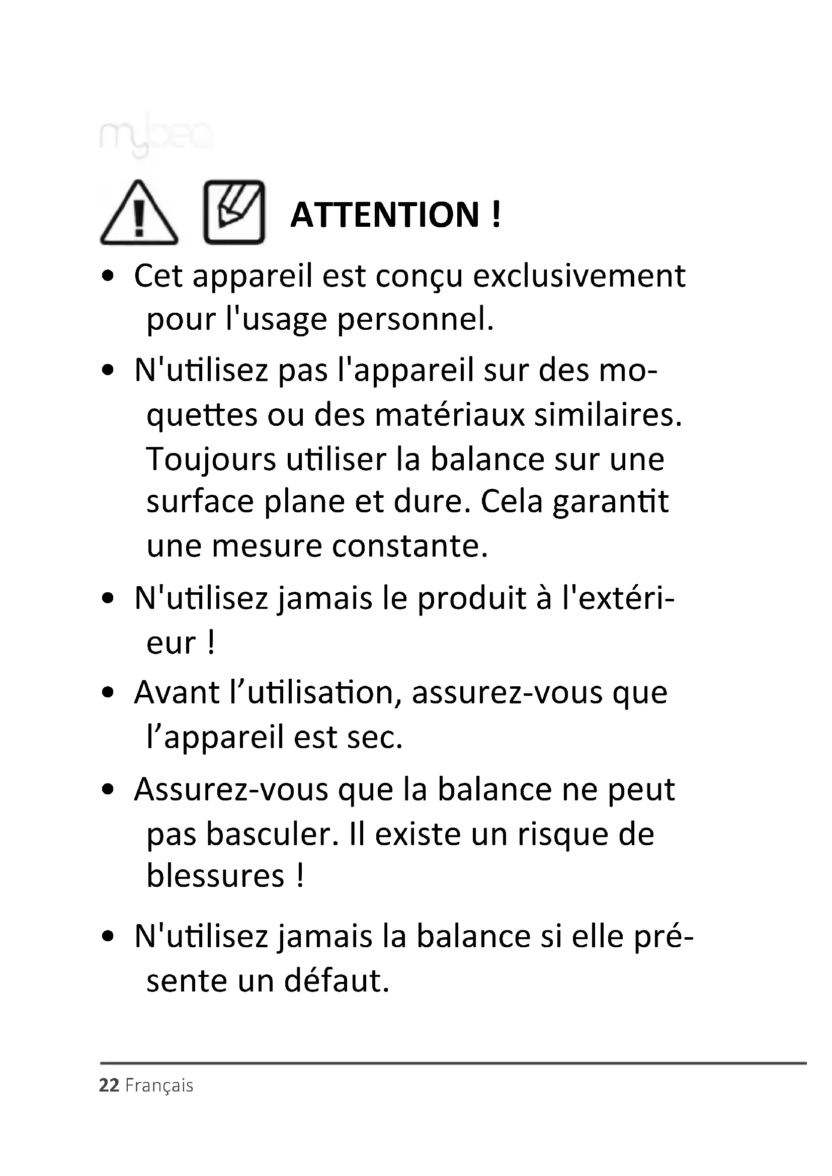 Assurez-vous que la balance ne peut pas basculer. Il existe un risque de blessures! -