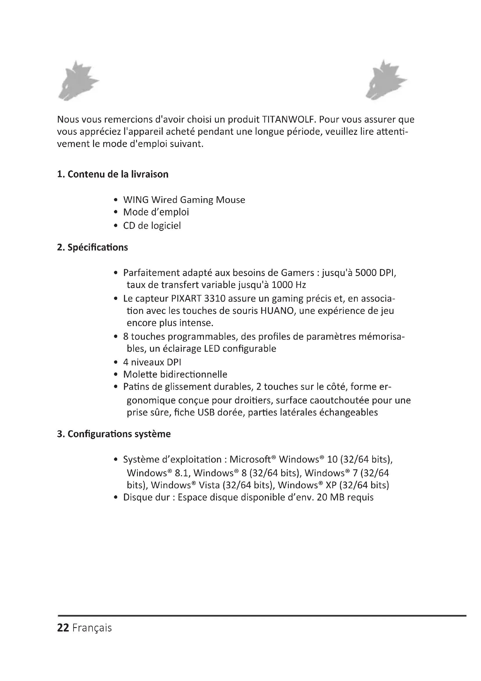 Nous vous remercions d'avoir choisi un produit TITANWOLF. Pour vous assurer que vous appréciez l'appareil acheté pendant une longue période, veuillez lire attentivement le mode d'emploi suivant.