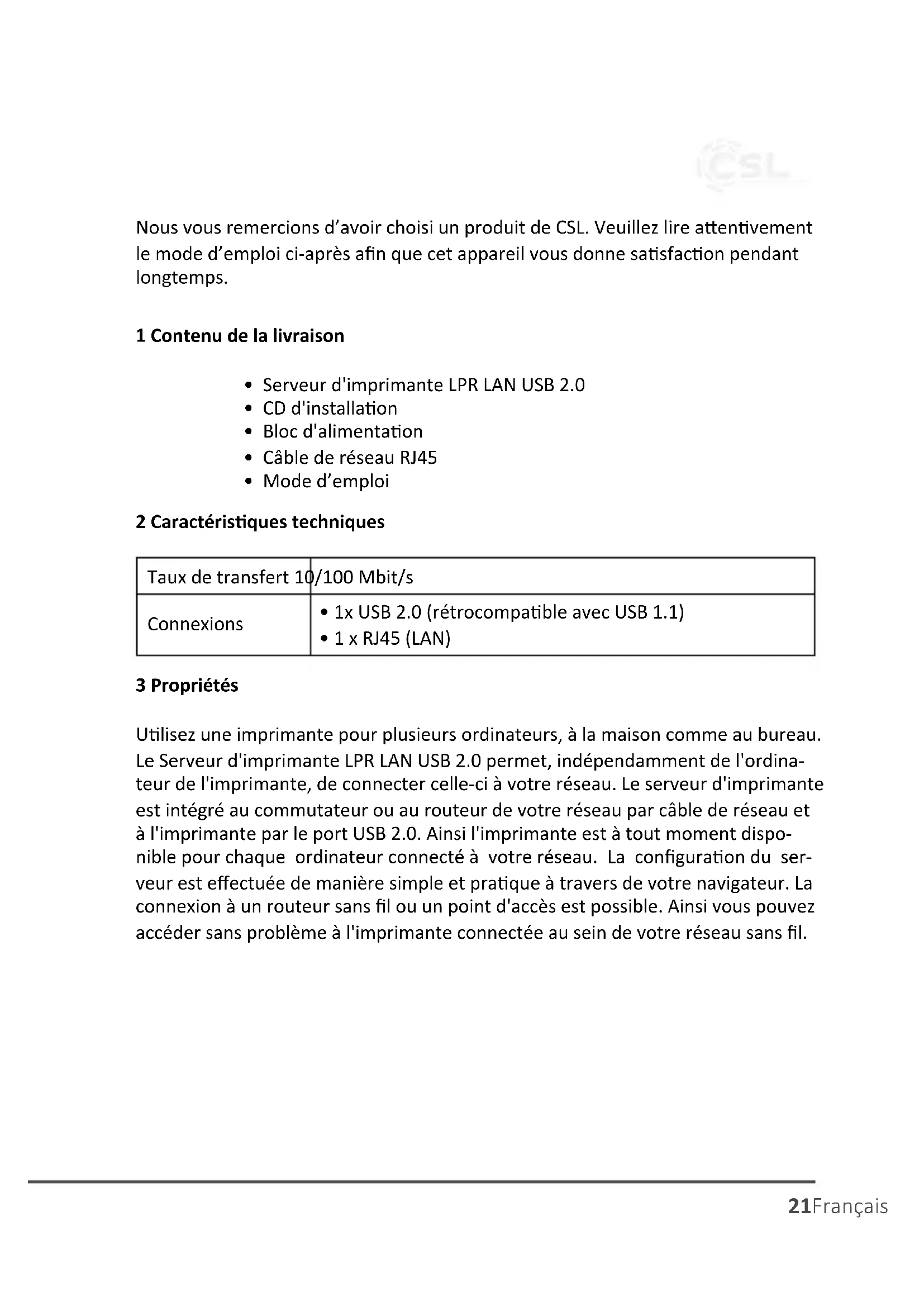 - 1 x RJ45 (LAN)22 Français 4 Mise en service Assurez-vous que votre réseau fonconne correctement. Connectez le câble USB de l'imprimante à connecter avec la prise USB du serveur d'imprimante. Branchez l'extrémité du câble de réseau RJ45 à la prise de réseau du serveur d'im- primante. Joignez l'autre extrémité du câble de réseau au réseau souhaité à travers d'un commutateur, routeur, concentrateur ou point d'accès. Branchez le bloc d'alimentaon au serveur d'imprimante et connectez-le à une prise de secteur. 5 Installaon sous Microso Windows avec le CD d'installaon Après avoir connecté les matériels, placez le CD d'installaon livrée dans votre lec- teur. Ou téléchargez le chier ZIP de l'adresse suivante : hps://p.csl-computer. com/pub/drivers/printserver/. Le programme d'installaon est alors ouvert automaquement. Exécutez le chier d'installaon en cliquant sur « Yes ». Cliquez ensuite sur « Terminer » pour terminer l'installaon. Après une installaon réussie du logiciel de pilote, le symbole « Launch Network- PrinterWizard.exe » se trouve sur votre bureau.23Français 6 Conguraon de l'imprimante Pour congurer une imprimante, cliquez sur l'icône « Launch NetworkPrinterWi- zard.exe » pour lancer l'assistant de conguraon. Cliquez ensuite sur l’onglet « Connuer ». Dans la suivante étape, séleconnez le modèle de votre imprimante, an que le pilote correspondant puisse être installé. Connuez en cliquant sur le bouton « Connuer ».24 Français Aenon: Le nombre d'imprimantes qui sont achées dans cee liste dépend du nombre d'imprimantes qui sont connectées à votre réseau. Si une seule imprimante se trouve dans le réseau, cee liste montrera une seule imprimante. Si votre impri- mante ne se trouve pas dans la liste, placez le CD d'installaon de votre imprimante dans le lecteur et séleconnez le bouton « Have Disk ». Vous devez chercher le dossier qui conent le pilote pour votre imprimante. Cliquez ensuite sur « Ouvrir » pour uliser ce pilote. Séleconnez le pilote dans la liste et cliquez sur le bouton « Connuer ». Lorsque le pilote correspondant a été installé, cliquez sur « Terminer ».25Français Après une installaon réussie, vous pouvez trouver l'imprimante ajoutée sous Panneau de conguraon – Imprimantes et fax. Selon le système d'exploitaon, la désignaon peut varier. Pour uliser l'imprimante ajoutée, vous devez la séleconner dans la liste d'im- primantes.26 Français 7 Conguraon de l'imprimante sans logiciel Comme alternave, vous pouvez aussi congurer le serveur d'imprimante manuel- lement sous Windows. Lancez, à cee n, le Panneau de conguraon. Naviguez à « Périphériques et im- primantes » et cliquez ensuite sur « Ajouter une imprimante ». Une fenêtre appa- rait. Séleconnez « Ajouter une imprimante réseau, sans l ou Bluetooth ». Si l'imprimante n'est pas trouvée, cliquez sur « L'imprimante voulue n'est pas dans la liste ». Séleconnez « Ajouter une imprimante en ulisant une adresse TCP/IP ou un nom d'hôte » et cliquez sur le bouton « Connuer ». Vous devez alors saisir l'adresse IP du serveur d'imprimante dans les deux champs existants. Vous pouvez trouver l'adresse IP, par exemple, dans le menu de votre routeur. Après la saisie, cliquez sur « Connuer ».27Français Après quelques secondes, une nouvelle fenêtre s'ouvre, « Des informaons de connexion supplémentaires sont nécessaires ». Ici, cliquez sur « Personnalisé » et ouvrez les « Conguraons ». Dans ce point de menu, séleconnez le protocole « LPR » et saisissez un nom de « le d'aente ». Cliquez ensuite sur « OK » et « Connuer ». Alors s'ouvre une fenêtre « Installer les pilotes de l'imprimante ». Cherchez votre imprimante dans la liste ou installez-la manuellement en cliquant sur « support de données » et le chemin dans lequel le pilote se trouve. La conguraon manuelle de votre serveur d'imprimante est terminée. 8 Liste des imprimantes compables (p. 48) Aenon: Le serveur d'imprimante LPR LAN USB 2.0 est compable avec une large gamme d'imprimantes qui supportent le standard LPR. Les modèles de la page 48 représente uniquement un aperçu des modèles d'imprimantes déjà testés.28 Français 9 Consignes de sécurité et clause de non responsabilité N’essayez jamais d’ouvrir l’appareil pour le réparer ou le modier. Évitez tout contact avec la tension du secteur. Ne court-circuitez pas l’appareil. L’appareil n’est pas étanche, veuillez l’uliser uniquement dans un endroit sec. Protégez-le d’un taux d’humidité élevé, de l’eau et de la neige. N’exposez pas l’appareil à des températures élevées. N’exposez pas l’appareil à des changements de température soudains ou à de fortes vibraons, car cela pourrait endommager les éléments électroniques. Vériez que l’appareil n’est pas endommagé avant de l’uliser. Ne pas uliser l’appareil s’il a subi un choc ou qu’il a été endommagé d’une quelconque autre manière. Veillez à respecter les disposions et les restricons naonales. N’ulisez pas l’appareil dans un autre but que celui indiqué dans les instrucons. Cet appareil n’est pas un jouet. Conservez-le hors de portée des enfants ou des personnes aeintes de troubles mentaux. Toute modicaon ou réparaon qui n’a pas été eectuée par le fournisseur d’origine entraîne l’annulaon de la garane et des droits de recours en garane. L’ulisaon de l’appareil est réservée aux personnes qui ont lu et compris les présentes instrucons. Les spécicaons de l’appareil peuvent être modiées sans nocaon préalable.29Français