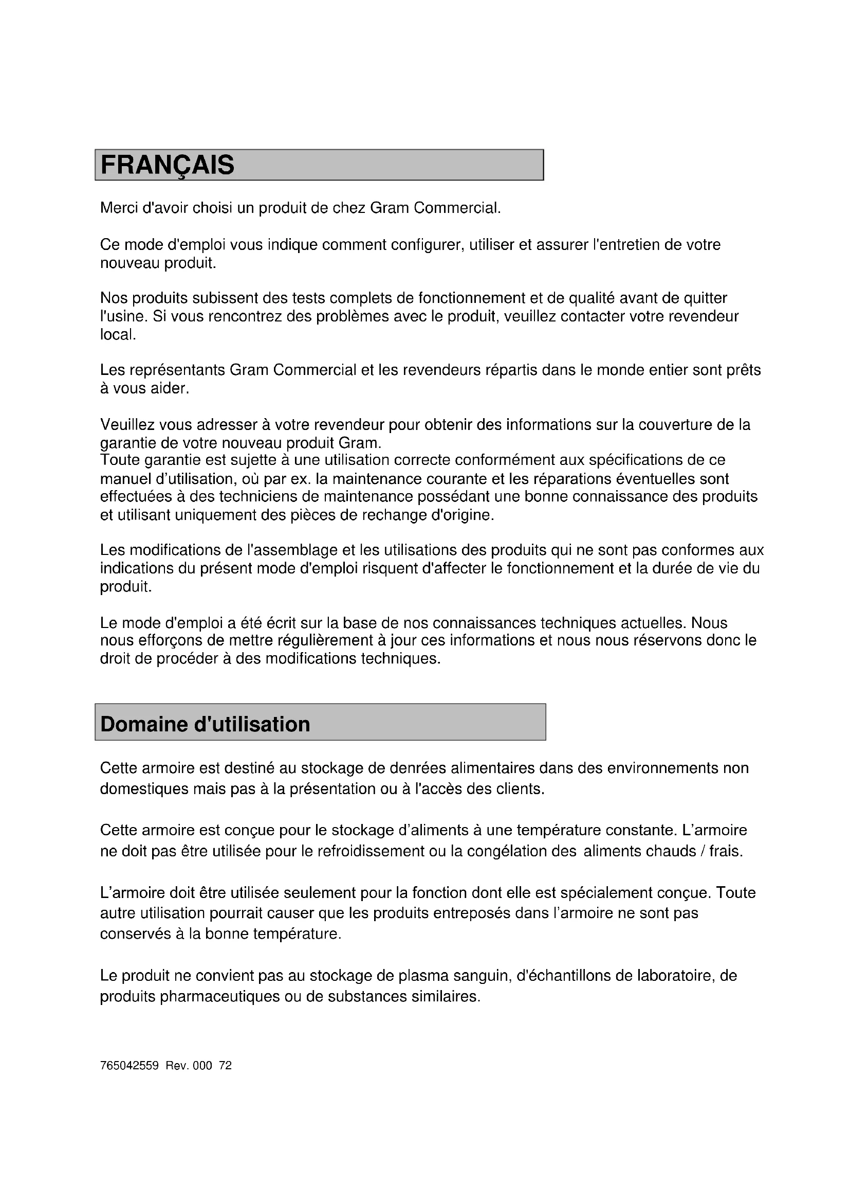 Merci d'avoir choisi un produit de chez Gram Commercial. Ce mode d'emploi vous indique comment configurer, utiliser et assurer l'entretien de votre nouveau produit. Nos produits subissent des tests complets de fonctionnement et de qualité avant de quitter l'usine. Si vous rencontrez des problèmes avec le produit, veuillez contacter votre revendeur local. Les représentants Gram Commercial et les revendeurs répartis dans le monde entier sont prêts à vous aider. Veuillez vous adresser à votre revendeur pour obtenir des informations sur la couverture de la garantie de votre nouveau produit Gram. Toute garantie est sujette à une utilisation correcte conformément aux spécifications de ce manuel d’utilisation, où par ex. la maintenance courante et les réparations éventuelles sont effectuées à des techniciens de maintenance possédant une bonne connaissance des produits et utilisant uniquement des pièces de rechange d'origine. Les modifications de l'assemblage et les utilisations des produits qui ne sont pas conformes aux indications du présent mode d'emploi risquent d'affecter le fonctionnement et la durée de vie du produit. Le mode d'emploi a été écrit sur la base de nos connaissances techniques actuelles. Nous nous efforçons de mettre régulièrement à jour ces informations et nous nous réservons donc le droit de procéder à des modifications techniques.