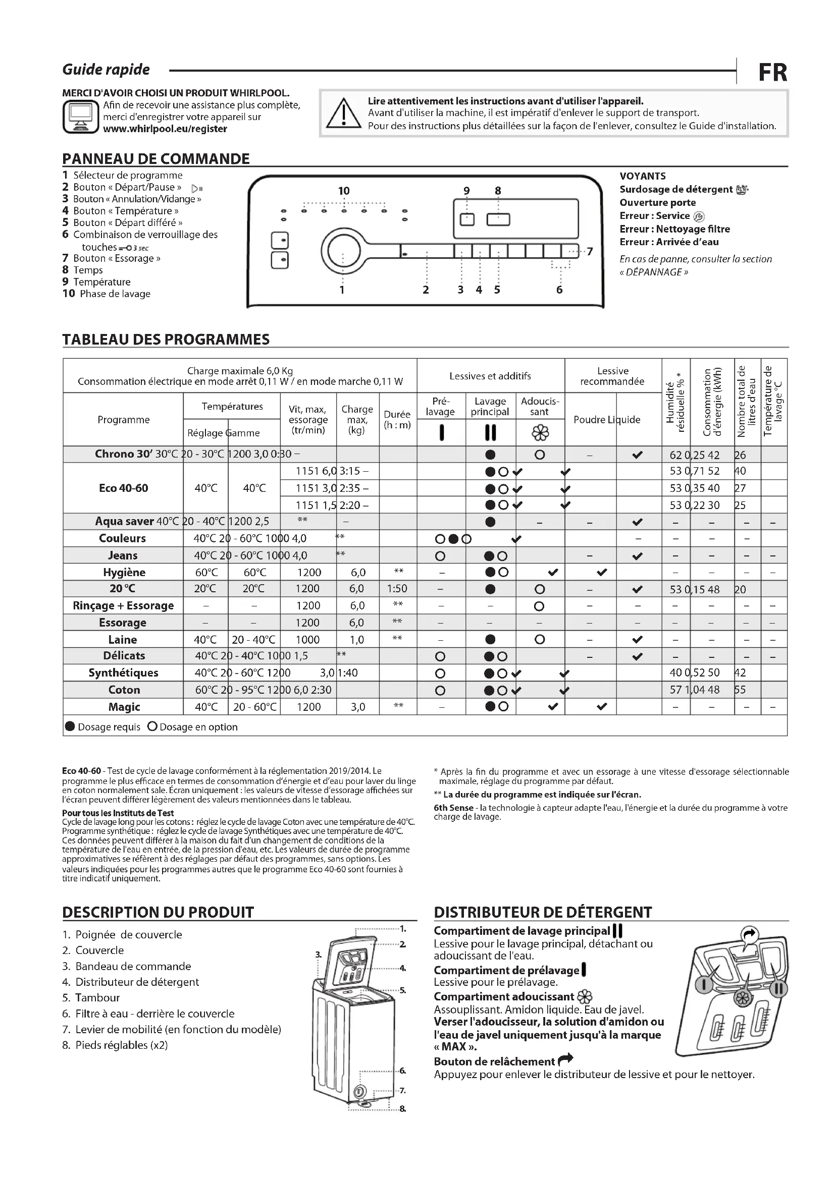 1 Sélecteur de programme 2 Bouton « Départ/Pause » 3 Bouton « Annulation/Vidange » 4 Bouton « Température » 5 Bouton « Départ diéré » 6 Combinaison de verrouillage des touches 7 Bouton « Essorage » 8 Temps 9 Température 10 Phase de lavage VOYANTS Surdosage de détergent Ouverture porte Erreur : Service Erreur : Nettoyage ltre Erreur : Arrivée d’eau En cas de panne, consulter la section « DÉPANNAGE » MERCI D'AVOIR CHOISI UN PRODUIT WHIRLPOOL. An de recevoir une assistance plus complète, merci d'enregistrer votre appareil sur www.whirlpool.eu/register