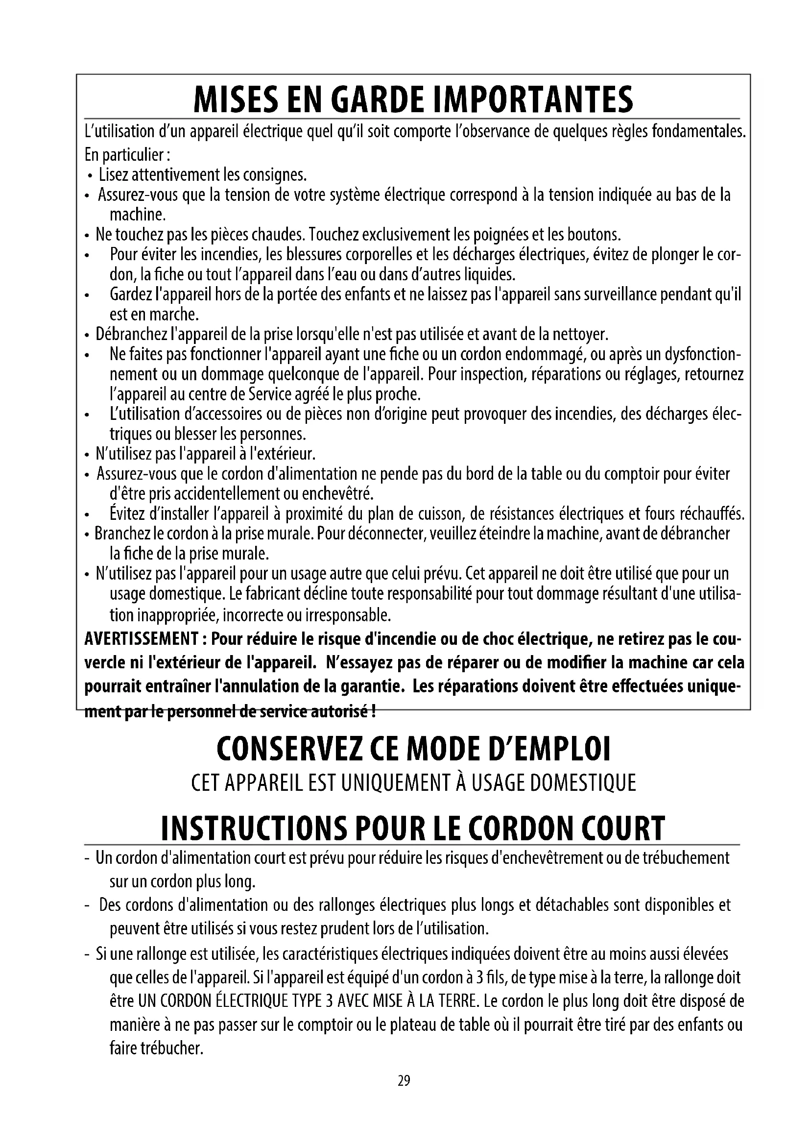 - Un cordon d'alimentation court est prévu pour réduire les risques d'enchevêtrement ou de trébuchement sur un cordon plus long. - Des cordons d'alimentation ou des rallonges électriques plus longs et détachables sont disponibles et peuvent être utilisés si vous restez prudent lors de l’utilisation. - Si une rallonge est utilisée, les caractéristiques électriques indiquées doivent être au moins aussi élevées que celles de l'appareil. Si l'appareil est équipé d'un cordon à 3 ls, de type mise à la terre, la rallonge doit être UN CORDON ÉLECTRIQUE TYPE 3 AVEC MISE À LA TERRE. Le cordon le plus long doit être disposé de manière à ne pas passer sur le comptoir ou le plateau de table où il pourrait être tiré par des enfants ou faire trébucher.30