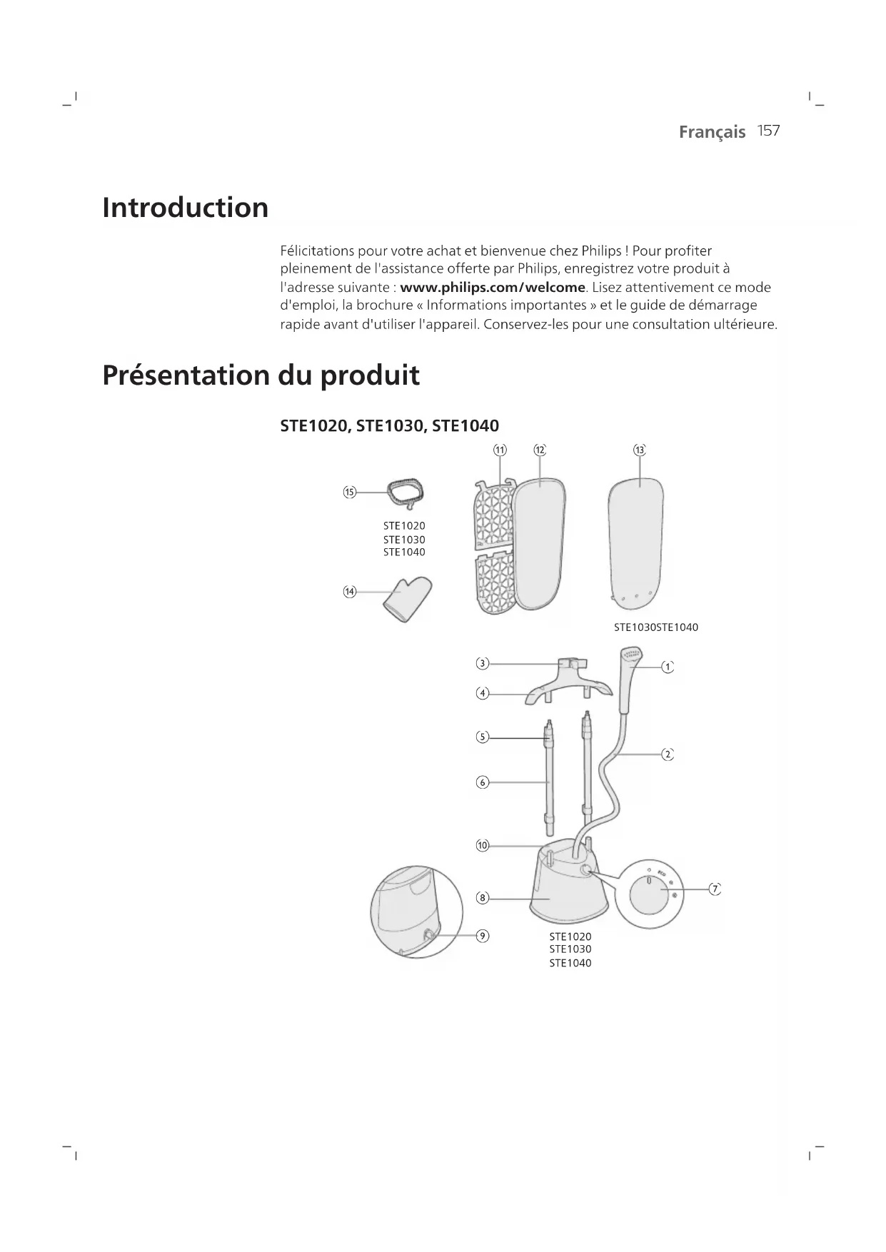 1 Tête du défroisseur 2 Cordon d'arrivée de la vapeur 3 Support du défroisseur 4 Cintre (STE1011, STE1020, STE1030, STE1040) 5 Clip de sécurité du mât 6 Mât 7 Sélecteur de vapeur 8 Base 9 Bouton de détartrage 10 Réservoir d'eau159 Français 11 Planche (STE1040) 12 Housse (STE1040) 13 Tapis (STE1030) 14 Gant 15 Brosse (STE1020, STE1030, STE1040) Avant utilisation Type d'eau à utiliser Cet appareil accepte l'eau du robinet. Cependant, si vous vivez dans une région où l'eau est dure, nous vous recommandons de mélanger une quantité égale d'eau du robinet et d'eau distillée ou déminéralisée. Cela permettra d'éviter l'accumulation rapide de calcaire et prolongera la durée de vie de l'appareil. N'utilisez pas de parfum, d'eau provenant d'un sèche-linge, de vinaigre, d'amidon, de détartrants, de produits d'aide au repassage ou d'autres agents chimiques car ils peuvent entraîner des projections d'eau, des taches marron ou endommager votre appareil. Avertissements 1 Ne placez aucune partie de la peau en contact direct avec la vapeur. 2 Ne dirigez pas la plaque vapeur vers d'autres personnes.160 Français 3 Ne tenez pas votre vêtement de manière à ce qu'il soit en contact direct avec la vapeur. 4 N'utilisez pas la tête du défroisseur en l'orientant vers le bas. 5 Ne pliez pas le cordon pour défroisser le vêtement. > 5 min. 6 Ne laissez pas le défroisseur sur pied sans surveillance pendant plus de 5minutes.161 Français