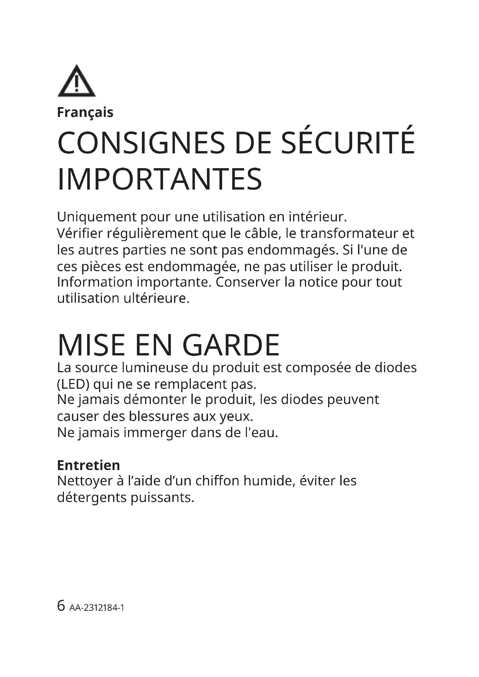 IMPORTANTES Uniquement pour une utilisation en intérieur. Vérier régulièrement que le câble, le transformateur et les autres parties ne sont pas endommagés. Si l'une de ces pièces est endommagée, ne pas utiliser le produit. Information importante. Conserver la notice pour tout utilisation ultérieure.