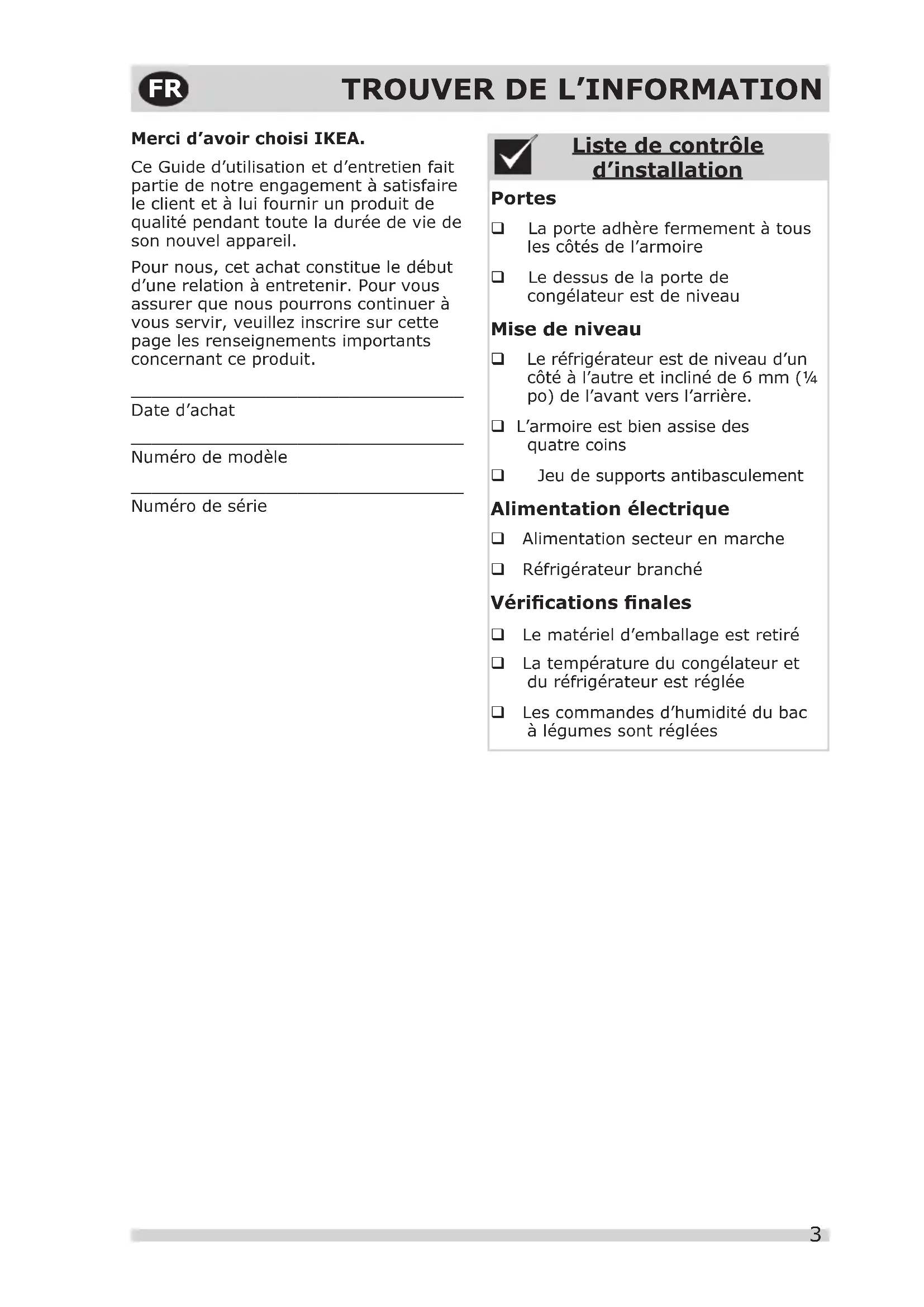 Merci d’avoir choisi IKEA. Ce Guide d’utilisation et d’entretien fait partie de notre engagement à satisfaire le client et à lui fournir un produit de qualité pendant toute la durée de vie de son nouvel appareil. Pour nous, cet achat constitue le début d’une relation à entretenir. Pour vous assurer que nous pourrons continuer à vous servir, veuillez inscrire sur cette page les renseignements importants concernant ce produit.