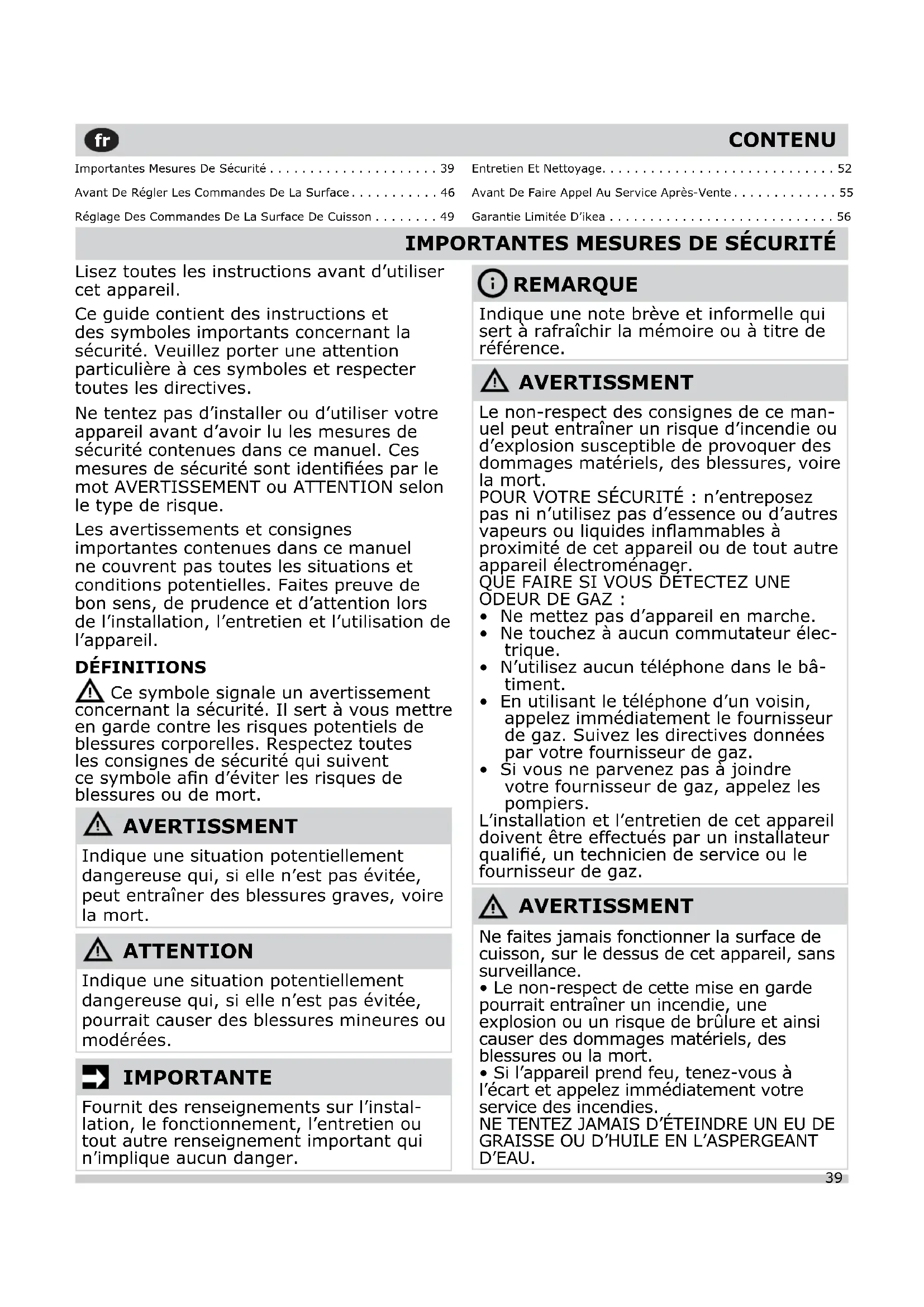 - Garantie Limitée D’ikea AVERTISSMENT Ne faites jamais fonctionner la surface de cuisson, sur le dessus de cet appareil, sans surveillance. p. 56