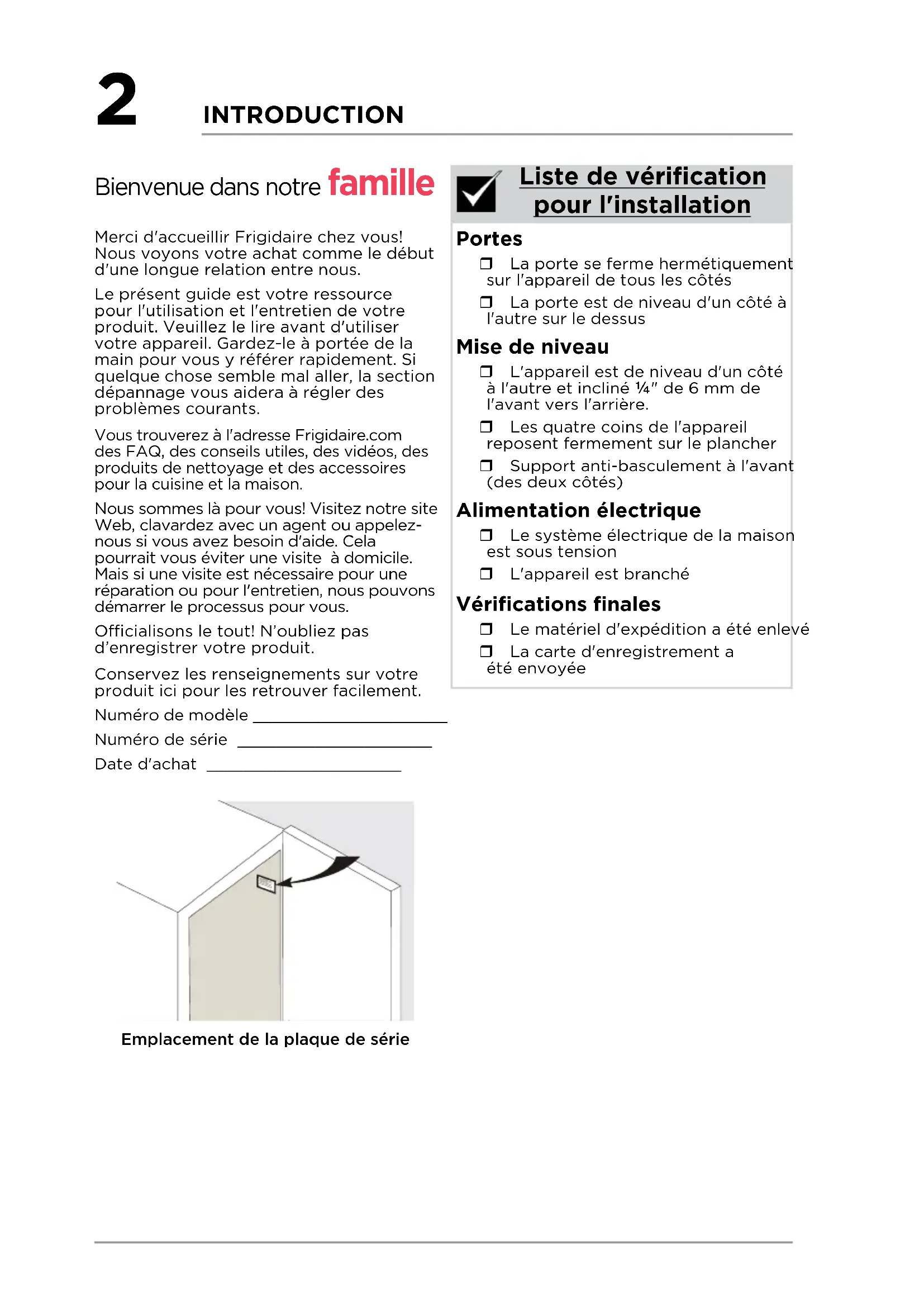 - Garantie limitée INTRODUCTION Portes La porte se ferme hermétiquement sur l'appareil de tous les côtés La porte est de niveau d'un côté à l'autre sur le dessus Mise de niveau L'appareil est de niveau d'un côté à l'autre et incliné ¼" de 6mm de l'avant vers l'arrière. Les quatre coins de l'appareil reposent fermement sur le plancher Support anti-basculement à l'avant (des deux côtés) Alimentation électrique Le système électrique de la maison est sous tension L'appareil est branché Vérifications finales Le matériel d'expédition a été enlevé La carte d'enregistrement a été envoyée Liste de vérification pour l'installation Bienvenue dans notrefamille Merci d'accueillir Frigidaire chez vous! Nous voyons votre achat comme le début d'une longue relation entre nous. Le présent guide est votre ressource pour l'utilisation et l'entretien de votre produit. Veuillez le lire avant d'utiliser votre appareil. Gardez-le à portée de la main pour vous y référer rapidement. Si quelque chose semble mal aller, la section dépannage vous aidera à régler des problèmes courants. Vous trouverez à l'adresse Frigidaire.com des FAQ, des conseils utiles, des vidéos, des produits de nettoyage et des accessoires pour la cuisine et la maison. Nous sommes là pour vous! Visitez notre site Web, clavardez avec un agent ou appelez- nous si vous avez besoin d'aide. Cela pourrait vous éviter une visite à domicile. Mais si une visite est nécessaire pour une réparation ou pour l'entretien, nous pouvons démarrer le processus pour vous. Ocialisons le tout! N’oubliez pas d’enregistrer votre produit. Conservez les renseignements sur votre produit ici pour les retrouver facilement. Numéro de modèle ____________________ Numéro de série ____________________ Date d'achat ____________________ INFORMATION IMPORTANTE p. 182