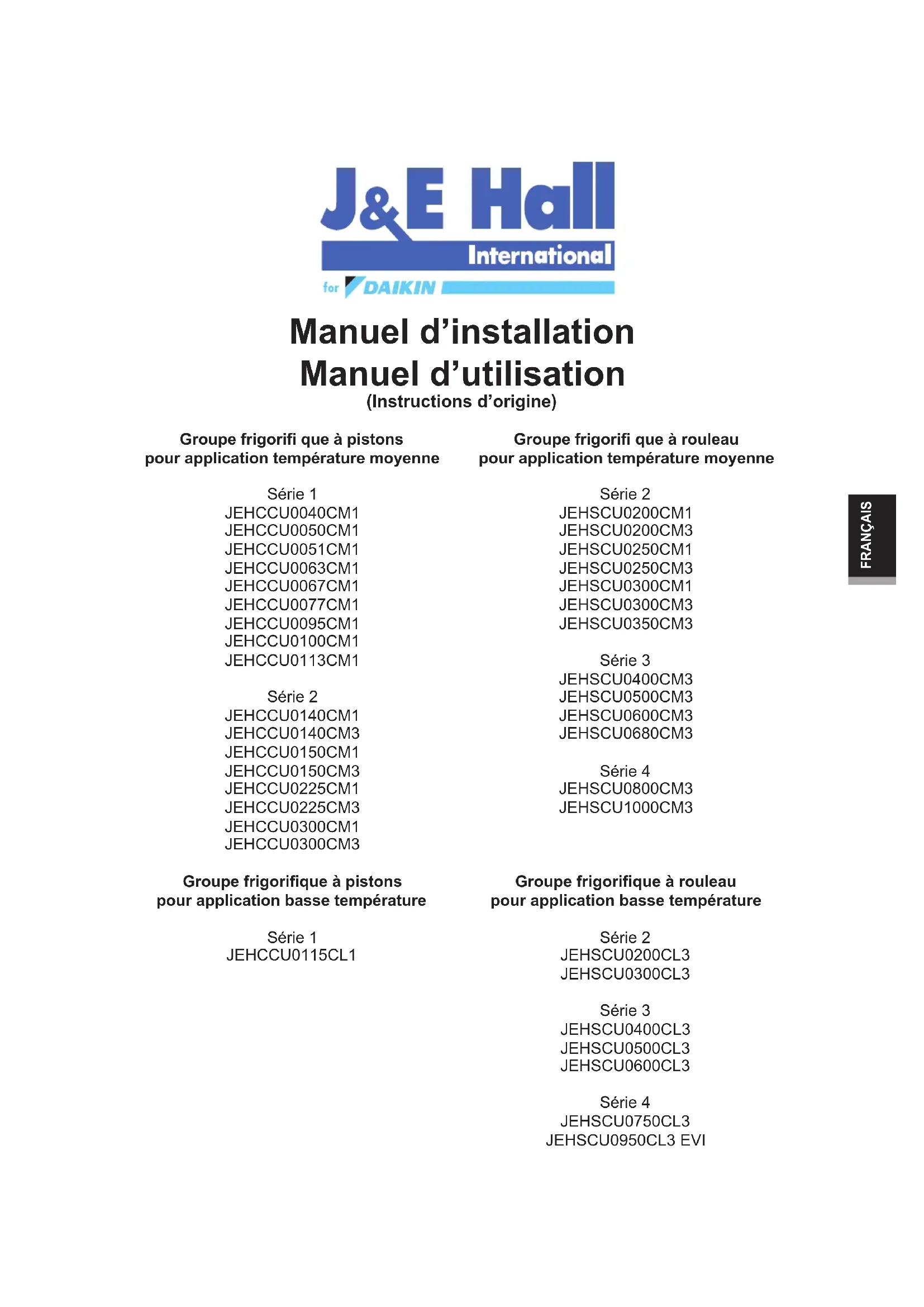 DEUTSCHGroupe frigorifi que à rouleau pour application température moyenne Groupe frigorifi que à pistons pour application température moyenne Série 1 JEHCCU0040CM1 JEHCCU0050CM1 JEHCCU0051CM1 JEHCCU0063CM1 JEHCCU0067CM1 JEHCCU0077CM1 JEHCCU0095CM1 JEHCCU0100CM1 JEHCCU0113CM1 Série 2 JEHCCU0140CM1 JEHCCU0140CM3 JEHCCU0150CM1 JEHCCU0150CM3 JEHCCU0225CM1 JEHCCU0225CM3 JEHCCU0300CM1 JEHCCU0300CM3 Groupe frigorifique à pistons pour application basse température Série 1 JEHCCU0115CL1 Série 2 JEHSCU0200CM1 JEHSCU0200CM3 JEHSCU0250CM1 JEHSCU0250CM3 JEHSCU0300CM1 JEHSCU0300CM3 JEHSCU0350CM3 Série 3 JEHSCU0400CM3 JEHSCU0500CM3 JEHSCU0600CM3 JEHSCU0680CM3 Série 4 JEHSCU0800CM3 JEHSCU1000CM3 Groupe frigorifique à rouleau pour application basse température Série 2 JEHSCU0200CL3 JEHSCU0300CL3 Série 3 JEHSCU0400C