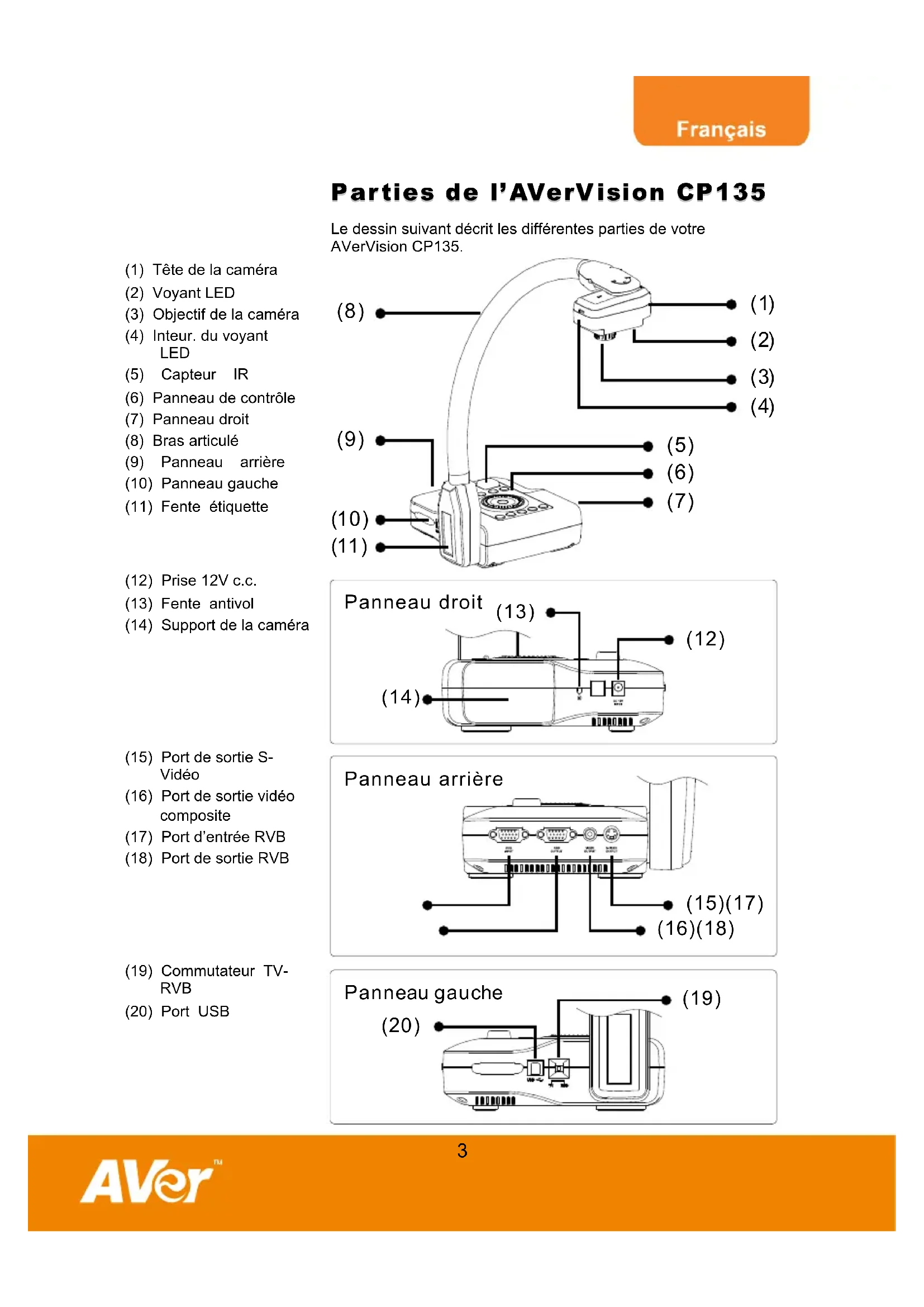Le dessin suivant décrit les différentes parties de votre AVerVision CP135. (1) Tête de la caméra (2) Voyant LED (3) Objectif de la caméra (4) Inteur. du voyant LED (5) Capteur IR (6) Panneau de contrôle (7) Panneau droit (8) Bras articulé (9) Panneau arrière (10) Panneau gauche (11) Fente étiquette (9) (8) (6)