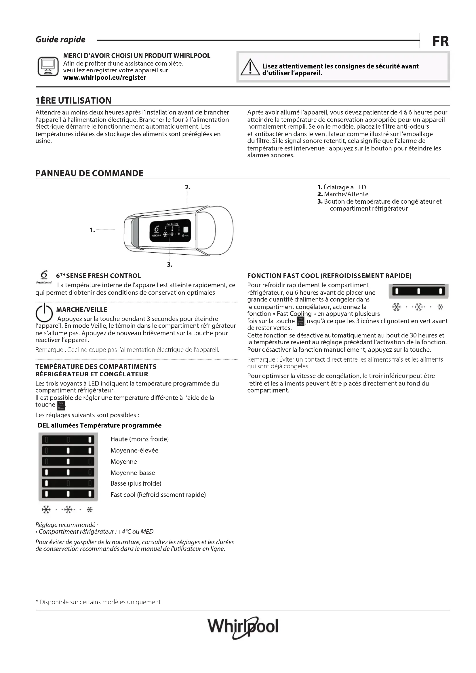 - Nur verfügbar bei bestimmten Modellen Hinweis: Wenn die Kühlgeräte-Deklaration auf dem Typenschild vorhanden ist (siehe Abbildung unten), gilt die Erklärung nur für die Norm EN62552:2013, die bis zum 28. Februar 2021 gültig ist.FR Guide rapide MERCI D’AVOIR CHOISI UN PRODUIT WHIRLPOOL Afin de profiter d’une assistance complète, veuillez enregistrer votre appareil sur www . whirlpool . eu/ register Lisez attentivement les consignes de sécurité avant d’utiliser l’appareil. 1ÈRE UTILISATION Attendre au moins deux heures après l’installation avant de brancher l’appareil à l’alimentation électrique. Brancher le four à l’alimentation électrique démarre le fonctionnement automatiquement. Les températures idéales de stockage des aliments sont préréglées en usine. Après avoir allumé l’appareil, vous devez patienter de 4 à 6 heures pour atteindre la température de conservation appropriée pour un appareil normalement rempli. Selon le modèle, placez le filtre anti-odeurs et antibactérien dans le ventilateur comme illustré sur l’emballage du filtre. Si le signal sonore retentit, cela signifie que l’alarme de température est intervenue: appuyez sur le bouton pour éteindre les alarmes sonores.