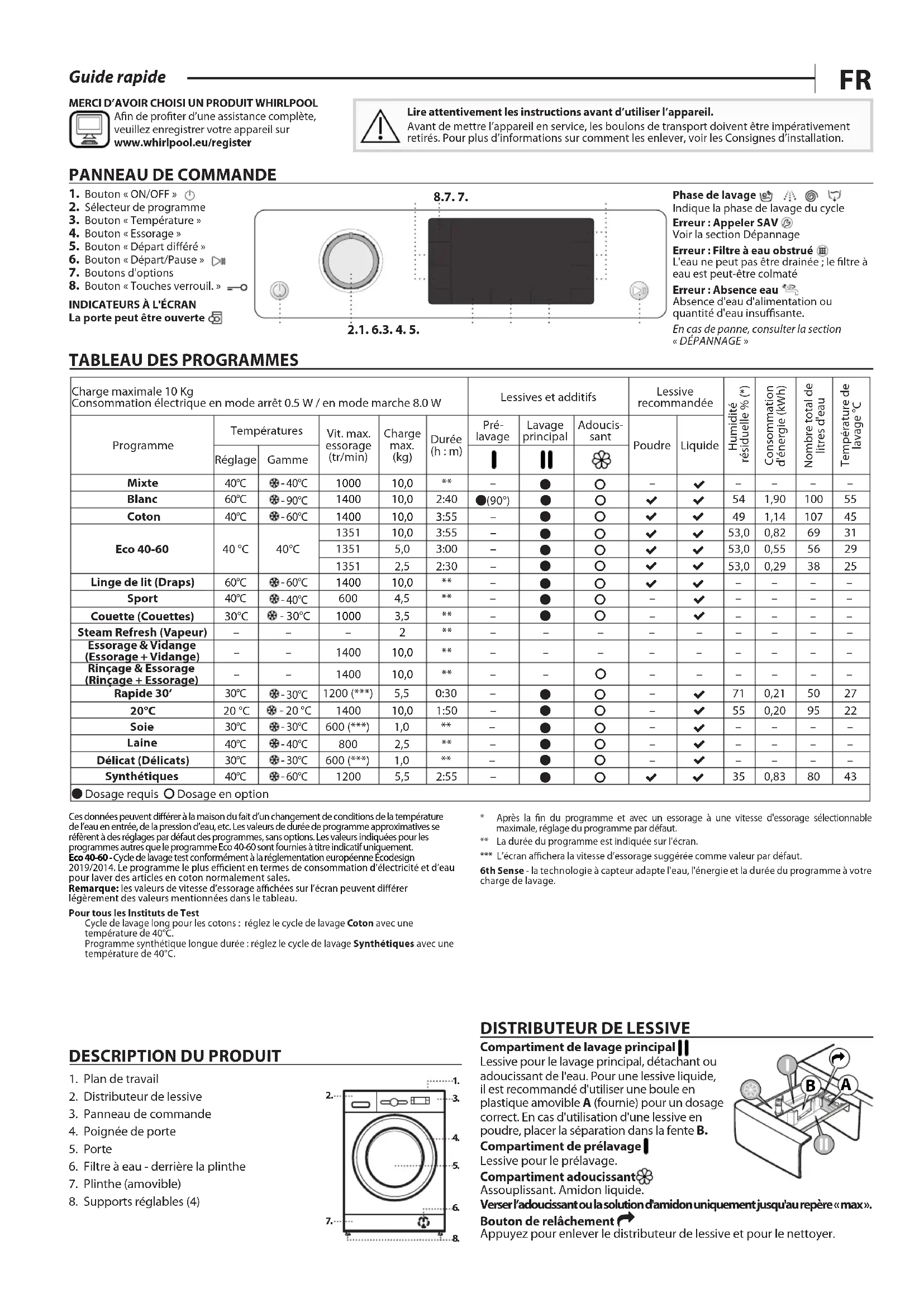 Guide rapide MERCI D’AVOIR CHOISI UN PRODUIT WHIRLPOOLAn de proter d’une assistance complète, veuillez enregistrer votre appareil sur www.whirlpool.eu/registerLire attentivement les instructions avant d’utiliser l’appareil.Avant de mettre l’appareil en service, les boulons de transport doivent être impérativement retirés. Pour plus d’informations sur comment les enlever, voir les Consignes d’installation.