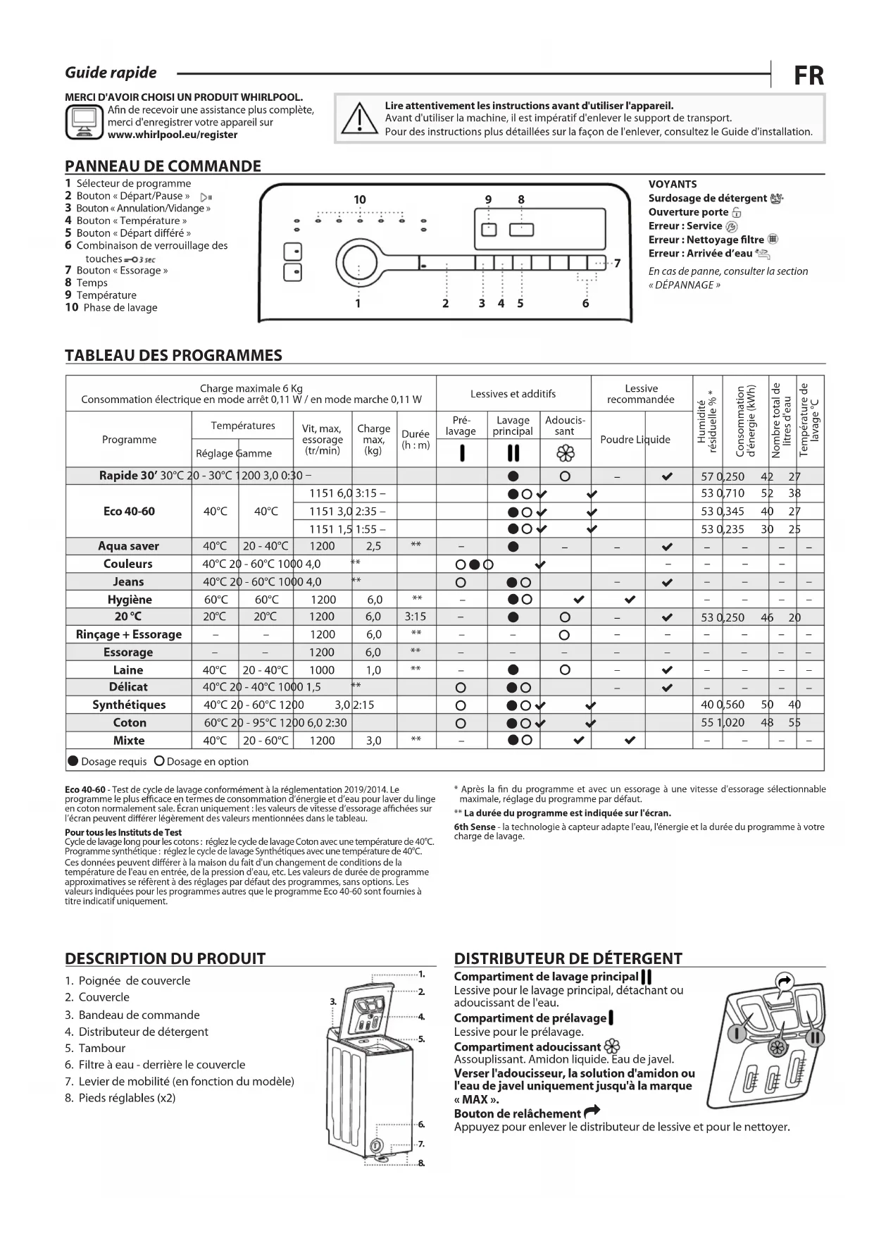 1 Sélecteur de programme 2 Bouton « Départ/Pause » 3 Bouton « Annulation/Vidange » 4 Bouton « Température » 5 Bouton « Départ diéré » 6 Combinaison de verrouillage des touches 7 Bouton « Essorage » 8 Temps 9 Température 10 Phase de lavage VOYANTS Surdosage de détergent Ouverture porte Erreur : Service Erreur : Nettoyage ltre Erreur : Arrivée d’eau En cas de panne, consulter la section « DÉPANNAGE » MERCI D'AVOIR CHOISI UN PRODUIT WHIRLPOOL. An de recevoir une assistance plus complète, merci d'enregistrer votre appareil sur www.whirlpool.eu/register