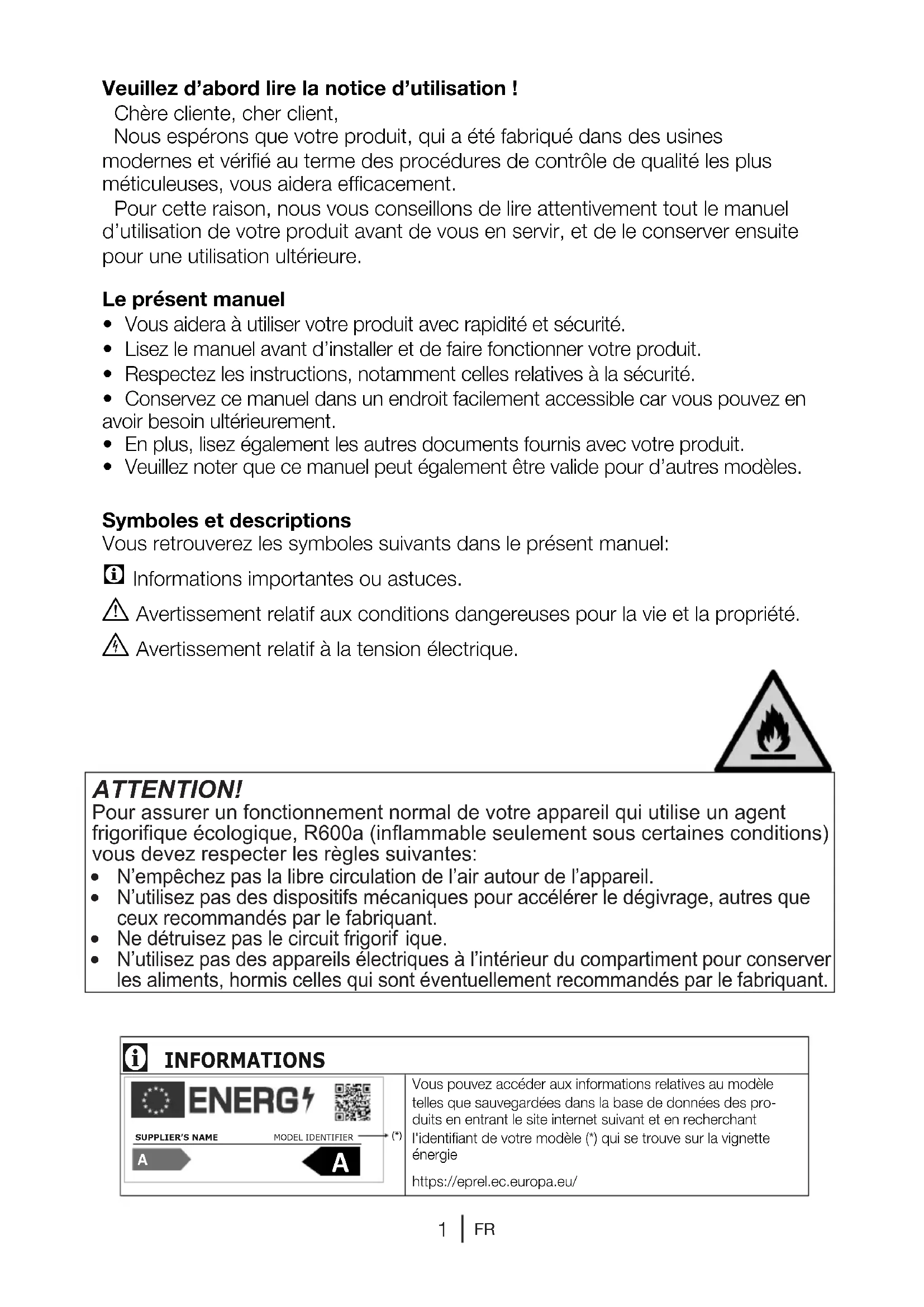 Conservez ce manuel dans un endroit facilement accessible car vous pouvez en avoir besoin ultérieurement. En plus, lisez également les autres documents fournis avec votre produit. Veuillez noter que ce manuel peut également être valide pour d’autres modèles.Symboles et descriptionsVous retrouverez les symboles suivants dans le présent manuel: C Informations importantes ou astuces. A Avertissement relatif aux conditions dangereuses pour la vie et la propriété. B Avertissement relatif à la tension électrique. ATTENTION! Pour assurer un fonctionnement normal de votre appareil qui utilise un agent frigorifique écologique, R600a (inflammable seulement sous certaines conditions) vous devez respecter les règles suivantes: