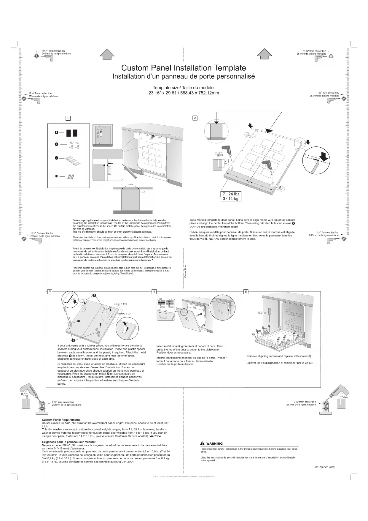 Before begining the custom panel installation, make sure the dishwasher is fully installed according the installation instructions. The top of the unit should be a minimum of 6mm from the counter and centered in the space. Be certain that the panel being installed is completely flat with no warpage.The top of dishwasher should be flush or lower than the adjacent cabinets.* Place door template on door, making sure correct side is up. Slide template up, until it butts against bottom of counter. Then mark height of adjacent cabinet door and drawer as shown. Avant de commencer l'installation du panneau de porte personnalisé, assurez-vous que le lave-vaisselle est entièrement installé conformément aux instructions d'installation. Le haut de l'unité doit être un minimum à 6 mm du comptoir et centré dans l'espace. Assurez-vous que le panneau en cours d'installation est complètement plat sans déformation. Le dessus du lave-vaisselle doit être affleurant ou plus bas que les armoires adjacentes. * Placer le gabarit sur la porte, en s’assurant que le bon côté est sur le dessus. Faire glisser le gabarit vers le haut jusqu’à ce qu’il s’appuie sur le bas du comptoir. Marquer ensuite la hau-teur de la porte du comptoir adjacents, tel qu’il est illustré. Custom Panel Installation Template Installation d’un panneau de porte personnalisé Template size/ Taille du modèle: 23.16” x 29.61 / 588.43 x 752.12mm 10 ¼" from center line261mm de la ligne médiane11 ¹⁄8" from center line283mm de la ligne médiane11 ¹⁄8" from center line283mm de la ligne médiane9 ⁷⁄8" from center line251mm de la ligne médiane 9 ⁷⁄8" from center line251mm de la ligne médiane11 ¹⁄8" from center line283mm de la ligne médiane11 ¹⁄8" from center line283mm de la ligne médiane11 ¹⁄8" from center line283mm de la ligne médianeKreutz, Christa [GDE-SRM] - 60100009194996/A1 - Released - 29.Aug.2022 16:00:50