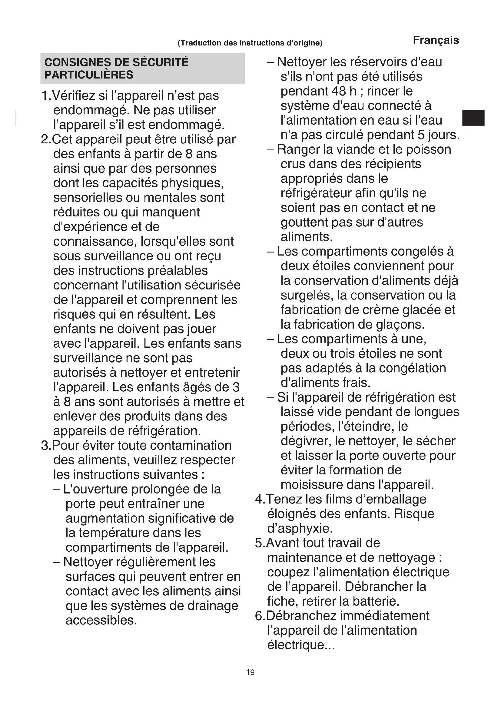 Cet apparéil peut être utilisé par des enfants à partir de 8 ans ainsi que par des personnes dont les capacities physiques, sensorielles ou mentales sont réduites ou qui manquent d'expérience et de connaissance, lorsqu'elles sont sous surveillance ou ont reçu des instructions préalables concernant l'utilisation sécurisée de l' apparéil et comprendnant les risques qui en résultat. Les enfants ne doivent pas jouer avec l' apparéil. Les enfants sans surveillance ne sont pas autorisés à nettoyer et entretenir l' apparéil. Les enfants âgés de 3 à 8 ans sont autorisés àmettre et enlever des produits dans des apparéils de réfrigération.