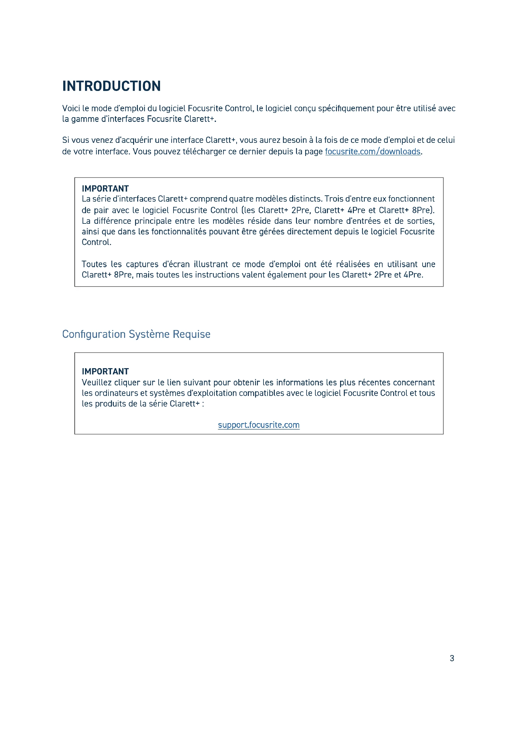INTRODUCTION Voici le mode d'emploi du logiciel Focusrite Control, le logiciel conçu spécifiquement pour être utilisé avec la gamme d'interfaces Focusrite Clarett+. Si vous venez d'acquérir une interface Clarett+, vous aurez besoin à la fois de ce mode d'emploi et de celui de votre interface. Vous pouvez télécharger ce dernier depuis la page focusrite.com/downloads. Configuration Système Requise IMPORTANT Veuillez cliquer sur le lien suivant pour obtenir les informations les plus récentes concernant les ordinateurs et systèmes d'exploitation compatibles avec le logiciel Focusrite Control et tous les produits de la série Clarett+ : support.focusrite.com IMPORTANT La série d'interfaces Clarett+ comprend quatre modèles distincts. Trois d'entre eux fonctionnent de pair avec le logiciel Focusrite Control (les Clarett+ 2Pre, Clarett+ 4Pre et Clarett+ 8Pre). La différence principale entre les modèles réside dans leur nombre d'entrées et de sorties, ainsi que dans les fonctionnalités pouvant être gérées directement depuis le logiciel Focusrite Control. Toutes les captures d'écran illustrant ce mode d'emploi ont été réalisées en utilisant une Clarett+ 8Pre, mais toutes les instructions valent également pour les Clarett+ 2Pre et 4Pre.4 Installation des logiciels Le logiciel Focusrite Control pour Windows et Mac est disponible en téléchargement depuis le site Internet de Focusrite (focusrite.com/downloads).