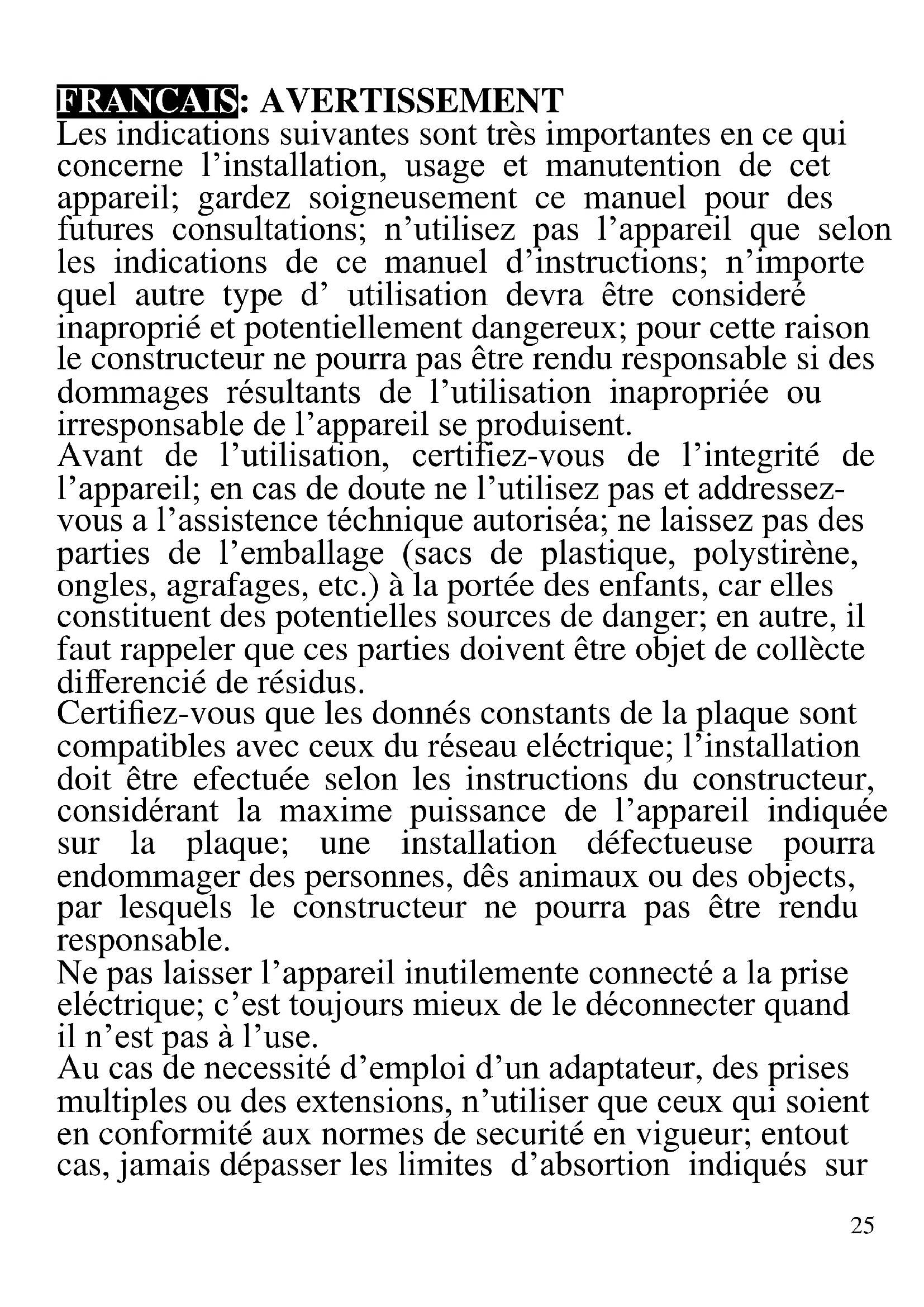 Avant de l'utilisation, certificez-vous de l'integrité de l'appareil; en cas de doute ne l'utilisez pas et addressez-vous a l'assistance technique autorisée; ne laissez pas des parties de l'emballage (sacs de plastique, polystirène, ongles, agrafages, etc.) à la portée des enfants, car elles constituent des potentielles sources de danger; en autre, il faut rappeler que ces parties doivent être objet de collecte différation de résidus.