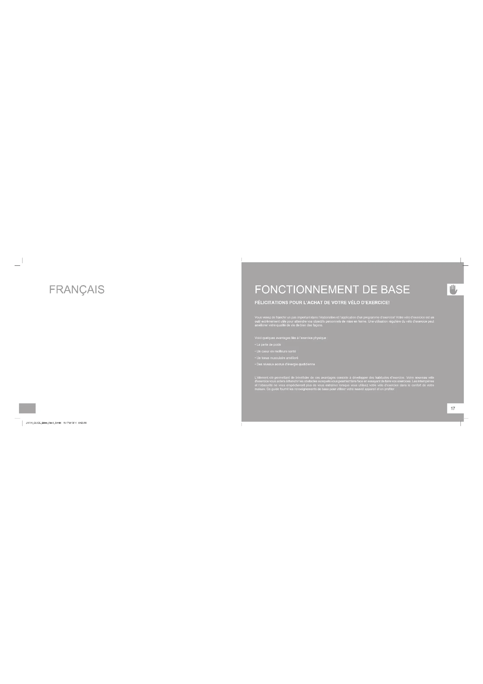 - Des niveaux accrus d’énergie quotidienne L’élément clé permettant de bénéficier de ces avantages consiste à développer des habitudes d’exercice. Votre nouveau vélo d’exercice vous aidera à franchir les obstacles auxquels vous pourriez faire face en essayant de faire vos exercices. Les intempéries et l’obscurité ne vous empêcheront plus de vous entraîner lorsque vous utilisez votre vélo d’exercice dans le confort de votre maison. Ce guide fournit les renseignements de base pour utiliser votre nouvel appareil et en profiter. JHT14_GUIDE_Bikes_Rev1_3.indd 16-17 8/13/14 8:42 AM1918