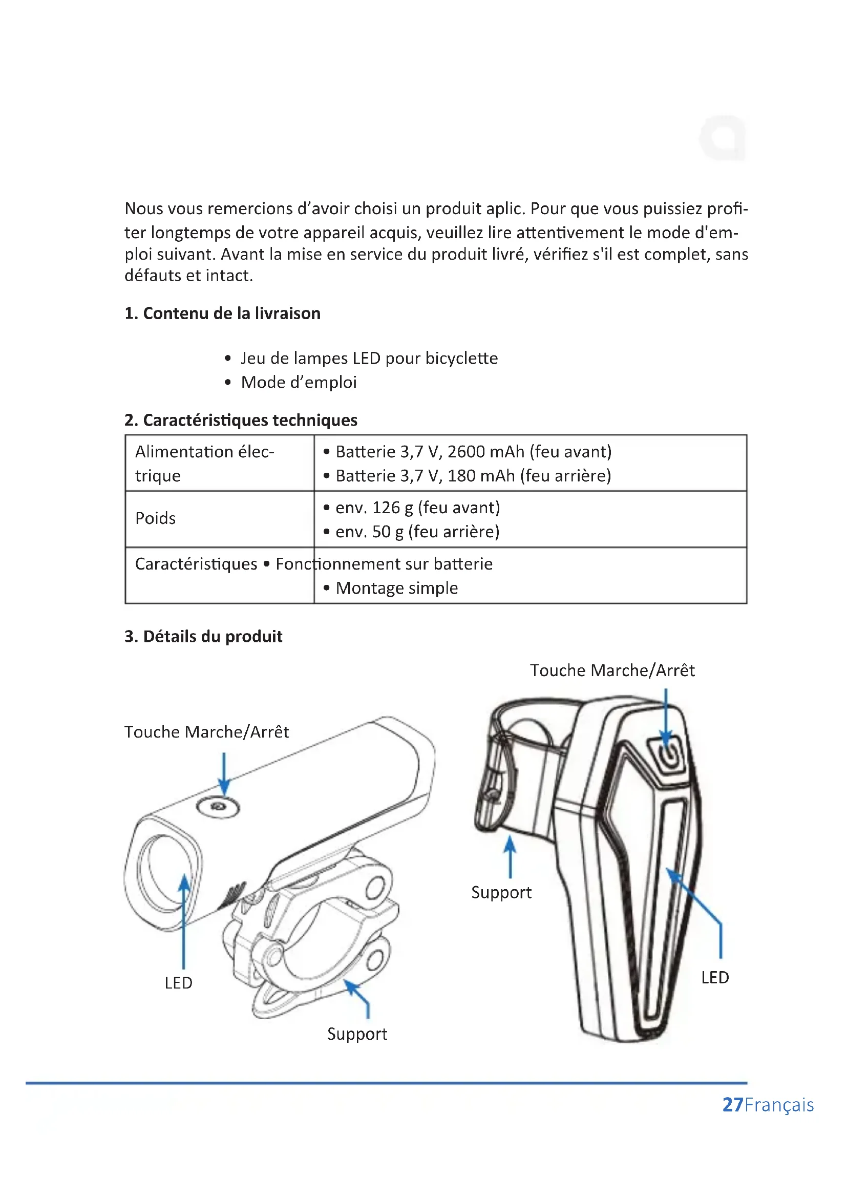 Nous vous remercions d'avoir choisi un produit aplic. Pour que vous puissiez profiter longtemps de votre appareil acquis, veuillez lire attentivement le mode d'emploi suivant. Avant la mise en service du produit livré, vérifiez s'il est complet, sans défauts et intact.