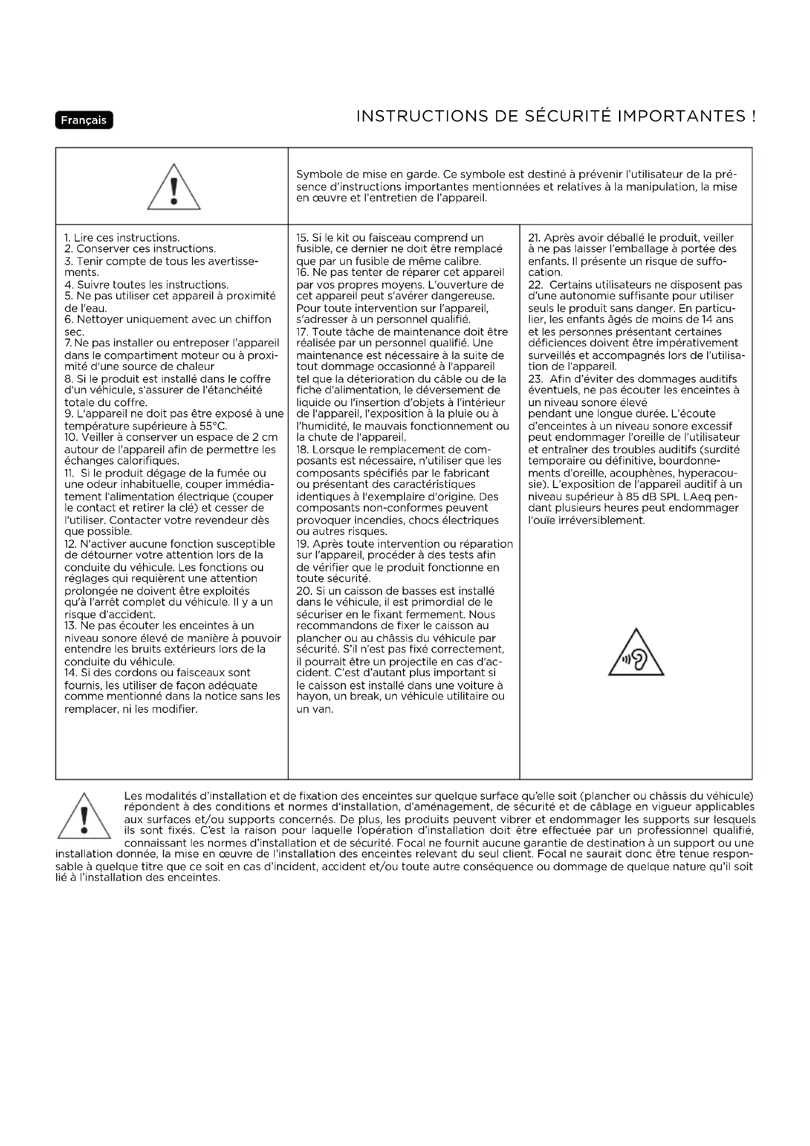 éventuels, ne pas écouter les enceintes à un niveau sonore élevé pendant une longue durée. L’écoute d’enceintes à un niveau sonore excessif peut endommager l’oreille de l’utilisateur et entraîner des troubles auditifs (surdité temporaire ou définitive, bourdonne- ments d’oreille, acouphènes, hyperacou- sie). L’exposition de l'appareil auditif à un niveau supérieur à 85 dB SPL LAeq pen- dant plusieurs heures peut endommager l’ouïe irréversiblement. INSTRUCTIONS DE SÉCURITÉ IMPORTANTES ! Français Les modalités d’installation et de fixation des enceintes sur quelque surface qu’elle soit (plancher ou châssis du véhicule) répondent à des conditions et normes d‘installation, d’aménagement, de sécurité et de câblage en vigueur applicables aux surfaces et/ou supports concernés. De plus, les produits peuvent vibrer et endommager les supports sur lesquels ils sont fixés. C’est la raison pour laquelle l’opération d’installation doit être eectuée par un professionnel qualifié, connaissant les normes d’installation et de sécurité. Focal ne fournit aucune garantie de destination à un support ou une installation donnée, la mise en œuvre de l’installation des enceintes relevant du seul client. Focal ne saurait donc être tenue respon- sable à quelque titre que ce soit en cas d’incident, accident et/ou toute autre conséquence ou dommage de quelque nature qu’il soit lié à l’installation des enceintes.13