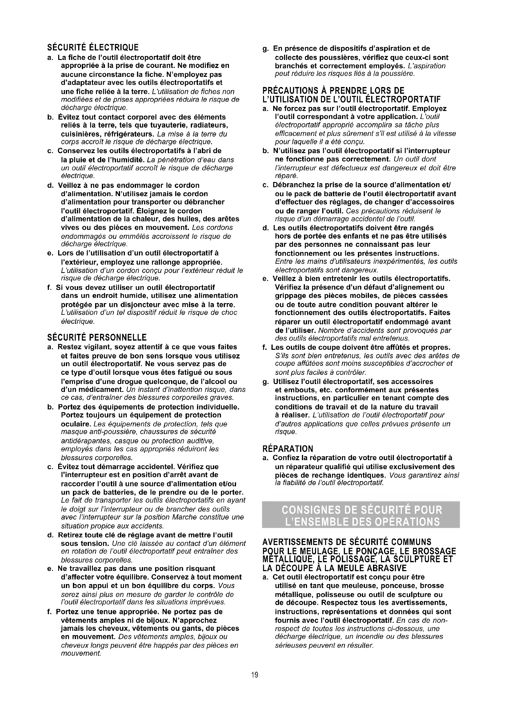 ATTENTION VEUILLEZ LIRE L’ENSEMBLE DES AVERTISSEMENTS DE SÉCURITÉ, AINSI QUE L’ENSEMBLE DES CONSIGNES Le non-respect de ces avertissements et de ces consignes peut entraîner une décharge électrique, un incendie et/ou des blessures corporelles graves. Conservez ces avertissements et ces consignes à des ns de référence future. Le terme « outil électroportatif » des avertissements se rapporte à votre outil électroportatif fonctionnant sur secteur (à cordon) ou sur batterie (sans cordon). SÉCURITÉ DE LA ZONE DE TRAVAIL a. Faites en sorte que la zone de travail soit propre et bien éclairée. Les risques d’accident sont plus élevés quand on travaille dans un endroit encombré ou sombre.b. Ne faites pas fonctionner des outils électroportatifs dans les atmosphères explosives, notamment en présence de liquides, gaz ou poussières inammables. Les outils électroportatifs produisent des étincelles susceptibles d’enammer les poussières ou fumées.c. Tenez les enfants et spectateurs à distance pendant le fonctionnement d’un outil électroportatif. Toute distraction peut entraîner une perte de contrôle de l’outil.
