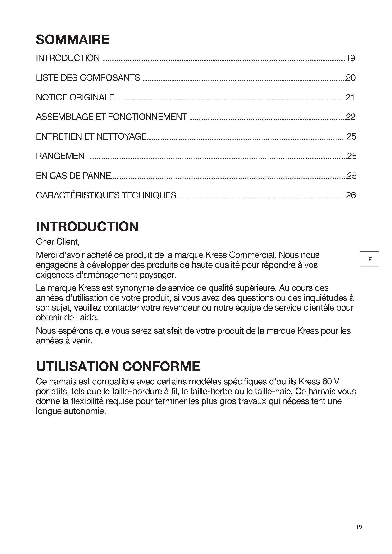 - CARACTÉRISTIQUES TECHNIQUES INTRODUCTION Cher Client, Merci d’avoir acheté ce produit de la marque Kress Commercial. Nous nous engageons à développer des produits de haute qualité pour répondre à vos exigences d'aménagement paysager. La marque Kress est synonyme de service de qualité supérieure. Au cours des années d'utilisation de votre produit, si vous avez des questions ou des inquiétudes à son sujet, veuillez contacter votre revendeur ou notre équipe de service clientèle pour obtenir de l'aide. Nous espérons que vous serez satisfait de votre produit de la marque Kress pour les années à venir. UTILISATION CONFORME Ce harnais est compatible avec certains modèles spéciques d’outils Kress 60 V portatifs, tels que le taille-bordure à l, le taille-herbe ou le taille-haie. Ce harnais vous donne la exibilité requise pour terminer les plus gros travaux qui nécessitent une longue autonomie.20 p. 26
