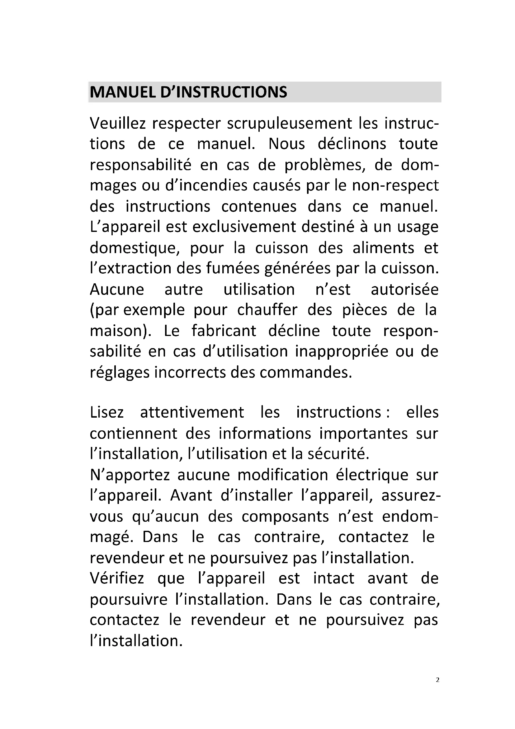Veuillez respecter scrupuleusement les instruc- tions de ce manuel. Nous déclinons toute responsabilité en cas de problèmes, de dom- mages ou d’incendies causés par le non-respect des instructions contenues dans ce manuel. L’appareil est exclusivement destiné à un usage domestique, pour la cuisson des aliments et l’extraction des fumées générées par la cuisson. Aucune autre utilisation n’est autorisée (par exemple pour chauffer des pièces de la maison). Le fabricant décline toute respon- sabilité en cas d’utilisation inappropriée ou de réglages incorrects des commandes. Lisez attentivement les instructions : elles contiennent des informations importantes sur l’installation, l’utilisation et la sécurité. N’apportez aucune modification électrique sur l’appareil. Avant d’installer l’appareil, assurez- vous qu’aucun des composants n’est endom- magé. Dans le cas contraire, contactez le revendeur et ne poursuivez pas l’installation. Vérifiez que l’appareil est intact avant de poursuivre l’installation. Dans le cas contraire, contactez le revendeur et ne poursuivez pas l’installation.3
