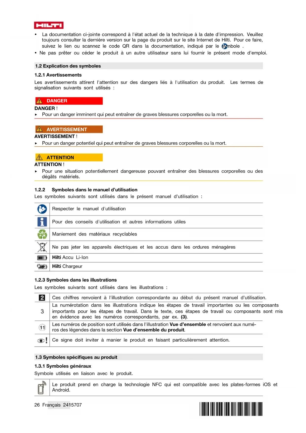 - La documentation ci-jointe correspond à l'état actuel de la technique à la date d'impression. Veuillez toujours consulter la dernière version sur la page du produit sur le site Internet de Hilti. Pour ce faire, suivez le lien ou scannez le code QR dans la documentation, indiqué par le symbole .