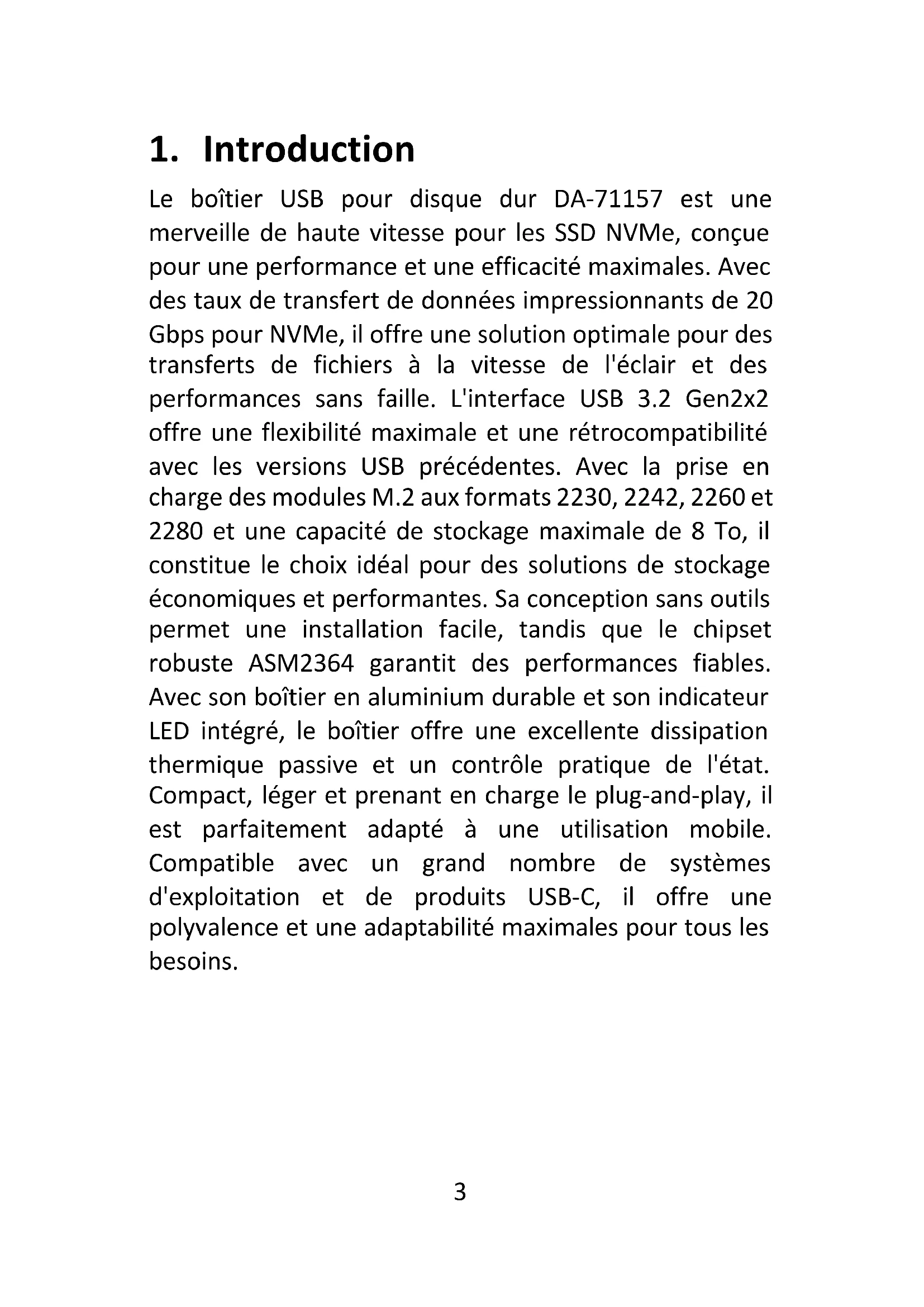 Le boîtier USB pour disque dur DA-71157 est une merveille de haute vitesse pour les SSD NVMe, conçue pour une performance et une efficacité maximales. Avec des taux de transfert de données impressionnants de 20 Gbps pour NVMe, il offre une solution optimale pour des transferts de fichiers à la vitesse de l'éclair et des performances sans faille. L'interface USB 3.2 Gen2x2 offre une flexibilité maximale et une rétrocompatibilité avec les versions USB précédentes. Avec la prise en charge des modules M.2 aux formats 2230, 2242, 2260 et 2280 et une capacité de stockage maximale de 8 To, il constitue le choix idéal pour des solutions de stockage économiques et performantes. Sa conception sans outils permet une installation facile, tandis que le chipset robuste ASM2364 garantit des performances fiables. Avec son boîtier en aluminium durable et son indicateur LED intégré, le boîtier offre une excellente dissipation thermique passive et un contrôle pratique de l'état. Compact, léger et prenant en charge le plug-and-play, il est parfaitement adapté à une utilisation mobile. Compatible avec un grand nombre de systèmes d'exploitation et de produits USB-C, il offre une polyvalence et une adaptabilité maximales pour tous les besoins.4