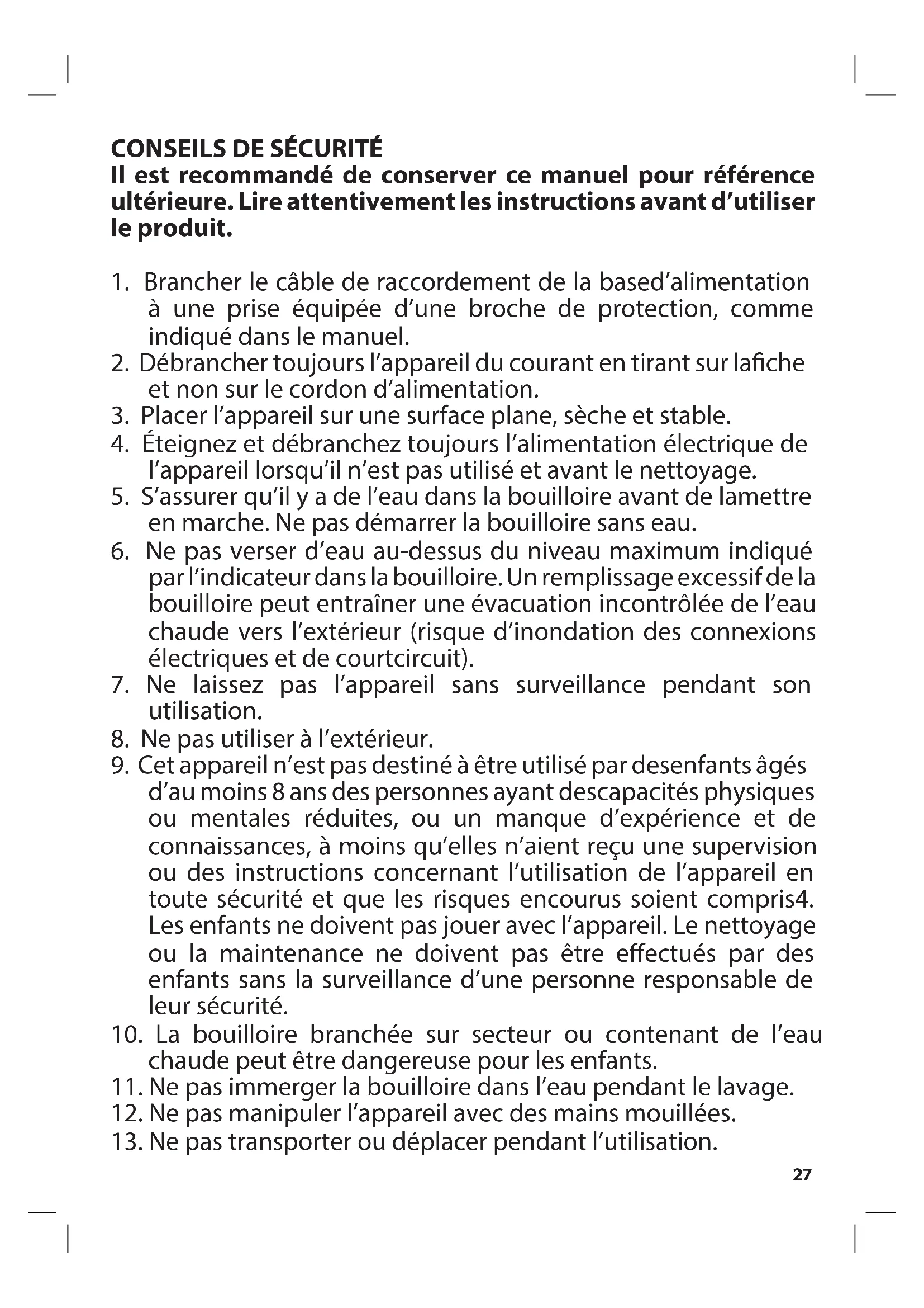 11. Ne pas immerger la bouilloire dans l’eau pendant le lavage.