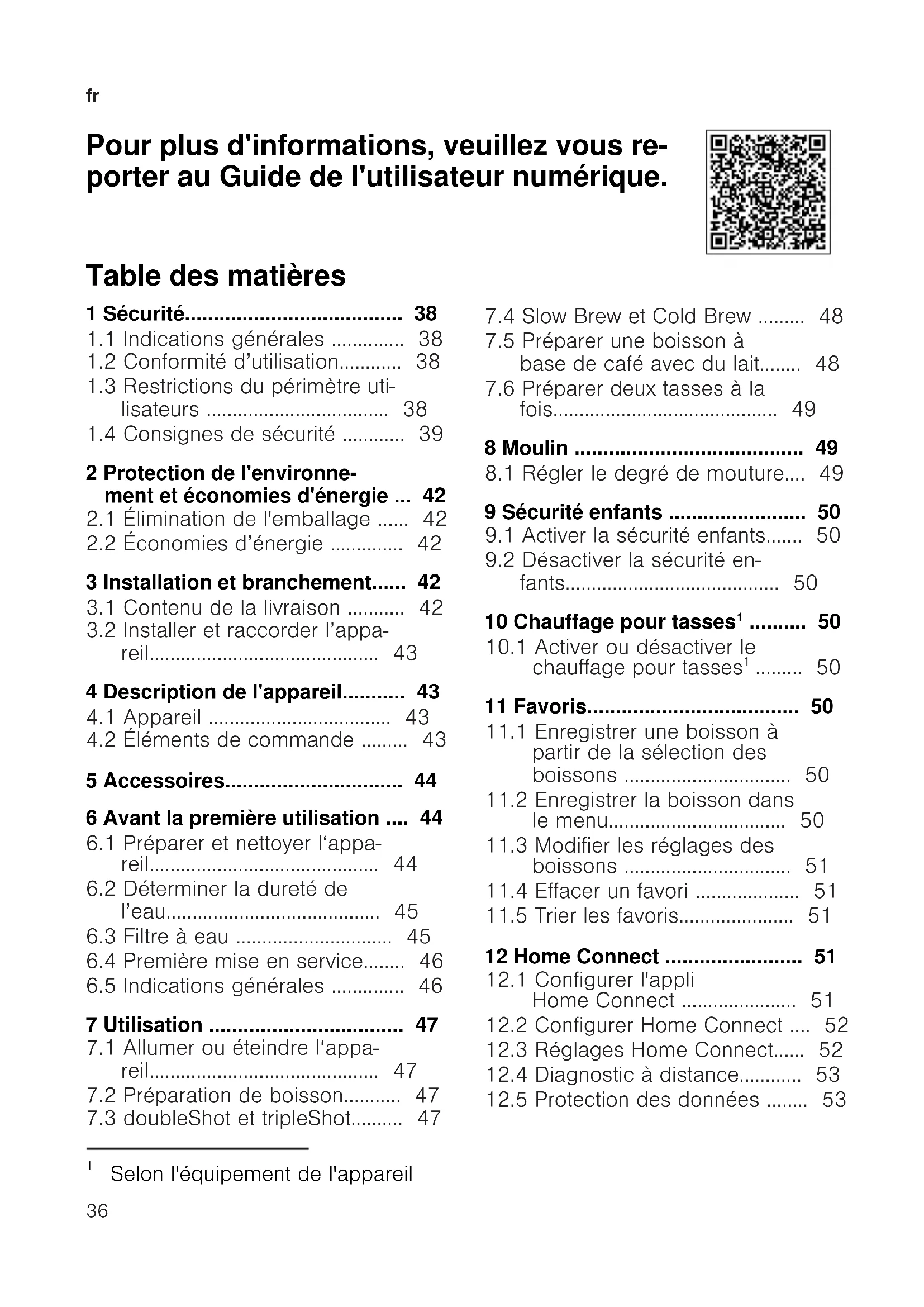 ▶ Seules des pièces de rechange d'origine peuvent être utilisées pour réparer l'appareil. ▶ Afin d’écarter tout danger quand le cordon d’alimentation sec- teur de cet appareil est endommagé, seul le fabricant ou son service après-vente ou toute autre personne de qualification équivalente est habilité à le remplacer. L’infiltration d’humidité peut occasionner un choc électrique. ▶ Ne jamais plonger l’appareil ou le cordon d’alimentation secteur dans l’eau. ▶ Veiller à ce qu’aucun liquide ne coule sur le raccordement de l’appareil. ▶ Utiliser l’appareil uniquement dans des pièces fermées. ▶ Ne jamais exposer l’appareil à une forte chaleur ou humidité. ▶ Ne pas utiliser de nettoyeur vapeur ou haute pression pour net- toyer l’appareil. AVERTISSEMENT‒Risque d'incendie! L’appareil devient chaud. ▶ Aérer suffisamment l’appareil. ▶ Ne jamais utiliser l’appareil dans une armoire. Il est dangereux d’utiliser un cordon d’alimentation secteur avec une rallonge ou un adaptateur non autorisé. ▶ Ne pas utiliser de rallonge ni de bloc multiprise. ▶ Utiliser uniquement des adaptateurs et cordons d’alimentation secteur agréés par le fabricant. ▶ Si le cordon d’alimentation secteur est trop court et qu’aucun cordon d’alimentation plus long n’est disponible, contacter un électricien spécialisé pour adapter l’installation domestique. AVERTISSEMENT‒Risque de brûlures! Certaines pièces de l’appareil deviennent très chaudes. ▶ Ne touchez jamais les pièces chaudes de l’appareil. ▶ Laisser refroidir les pièces chaudes de l’appareil après utilisa- tion et avant de les toucher. AVERTISSEMENT‒Risque de brûlure! Les boissons fraîchement préparées sont très chaudes. ▶ Si nécessaire, laisser refroidir les boissons.Sécurité fr