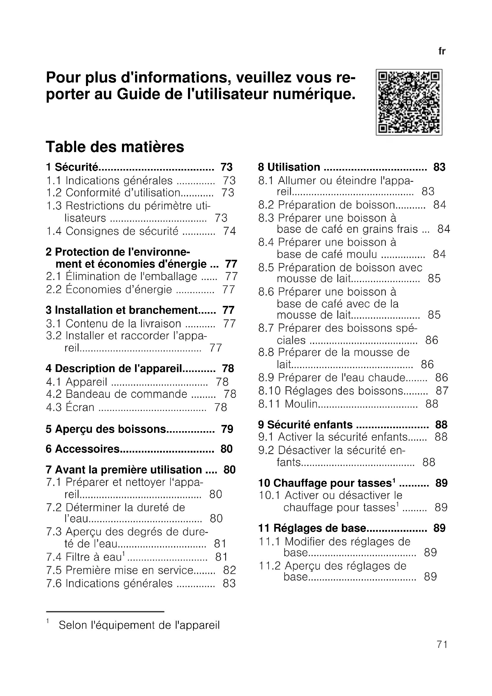 Pour plus d'informations, veuillez vous re- porter au Guide de l'utilisateur numérique. Table des matières 1 Sécurité......................................73