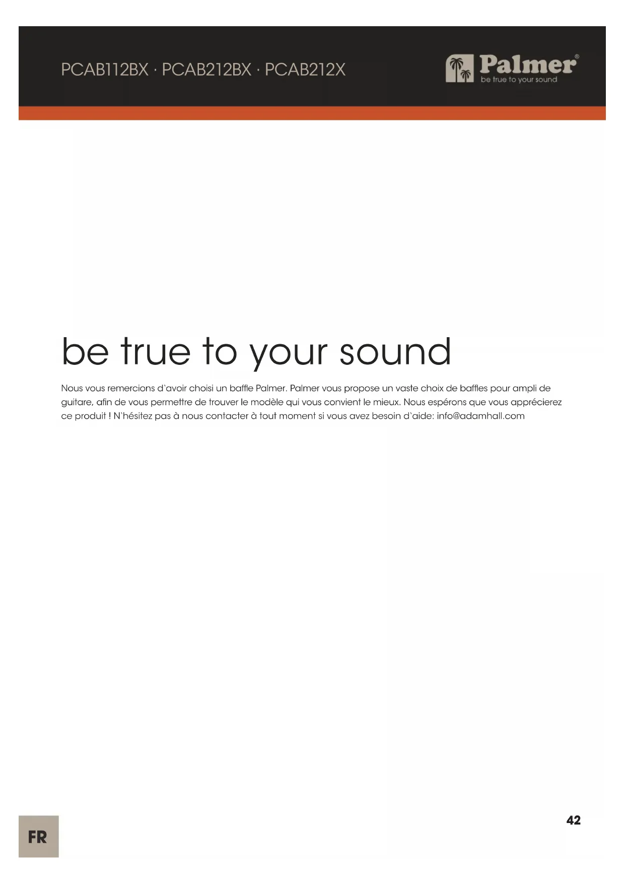 Nous vous remercions d'avoir choisi un baffle Palmer. Palmer vous propose un vaste choix de baffles pour ampli de guitare, afin de vous permettre de trouver le modèle qui vous convient le mieux. Nous espérons que vous apprécierez ce produit ! N'hésitez pas à nous contacter à tout moment si vous avez besoin d'aide: info@adamhall.com