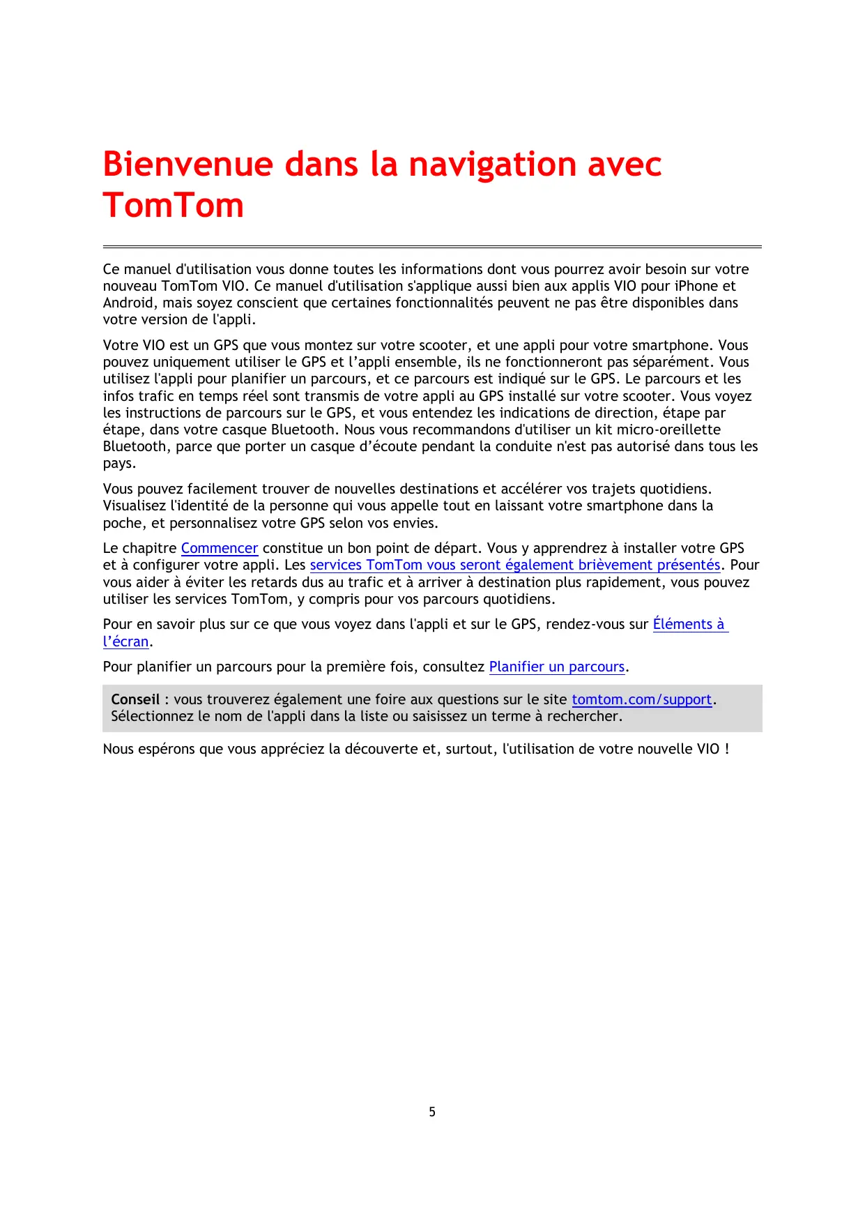 Bienvenue dans la navigation avec TomTom Ce manuel d'utilisation vous donne toutes les informations dont vous pourrez avoir besoin sur votre nouveau TomTom VIO. Ce manuel d'utilisation s'applique aussi bien aux applis VIO pour iPhone et Android, mais soyez conscient que certaines fonctionnalités peuvent ne pas être disponibles dans votre version de l'appli. Votre VIO est un GPS que vous montez sur votre scooter, et une appli pour votre smartphone. Vous pouvez uniquement utiliser le GPS et l’appli ensemble, ils ne fonctionneront pas séparément. Vous utilisez l'appli pour planifier un parcours, et ce parcours est indiqué sur le GPS. Le parcours et les infos trafic en temps réel sont transmis de votre appli au GPS installé sur votre scooter. Vous voyez les instructions de parcours sur le GPS, et vous entendez les indications de direction, étape par étape, dans votre casque Bluetooth. Nous vous recommandons d'utiliser un kit micro-oreillette Bluetooth, parce que porter un casque d’écoute pendant la conduite n'est pas autorisé dans tous les pays. Vous pouvez facilement trouver de nouvelles destinations et accélérer vos trajets quotidiens. Visualisez l'identité de la personne qui vous appelle tout en laissant votre smartphone dans la poche, et personnalisez votre GPS selon vos envies. Le chapitre Commencer constitue un bon point de départ. Vous y apprendrez à installer votre GPS et à configurer votre appli. Les services TomTom vous seront également brièvement présentés. Pour vous aider à éviter les retards dus au trafic et à arriver à destination plus rapidement, vous pouvez utiliser les services TomTom, y compris pour vos parcours quotidiens. Pour en savoir plus sur ce que vous voyez dans l'appli et sur le GPS, rendez-vous sur Éléments à l’écran. Pour planifier un parcours pour la première fois, consultez Planifier un parcours. Conseil : vous trouverez également une foire aux questions sur le site tomtom.com/support. Sélectionnez le nom de l'appli dans la liste ou saisissez un terme à rechercher. Nous espérons que vous appréciez la découverte et, surtout, l'utilisation de votre nouvelle VIO !