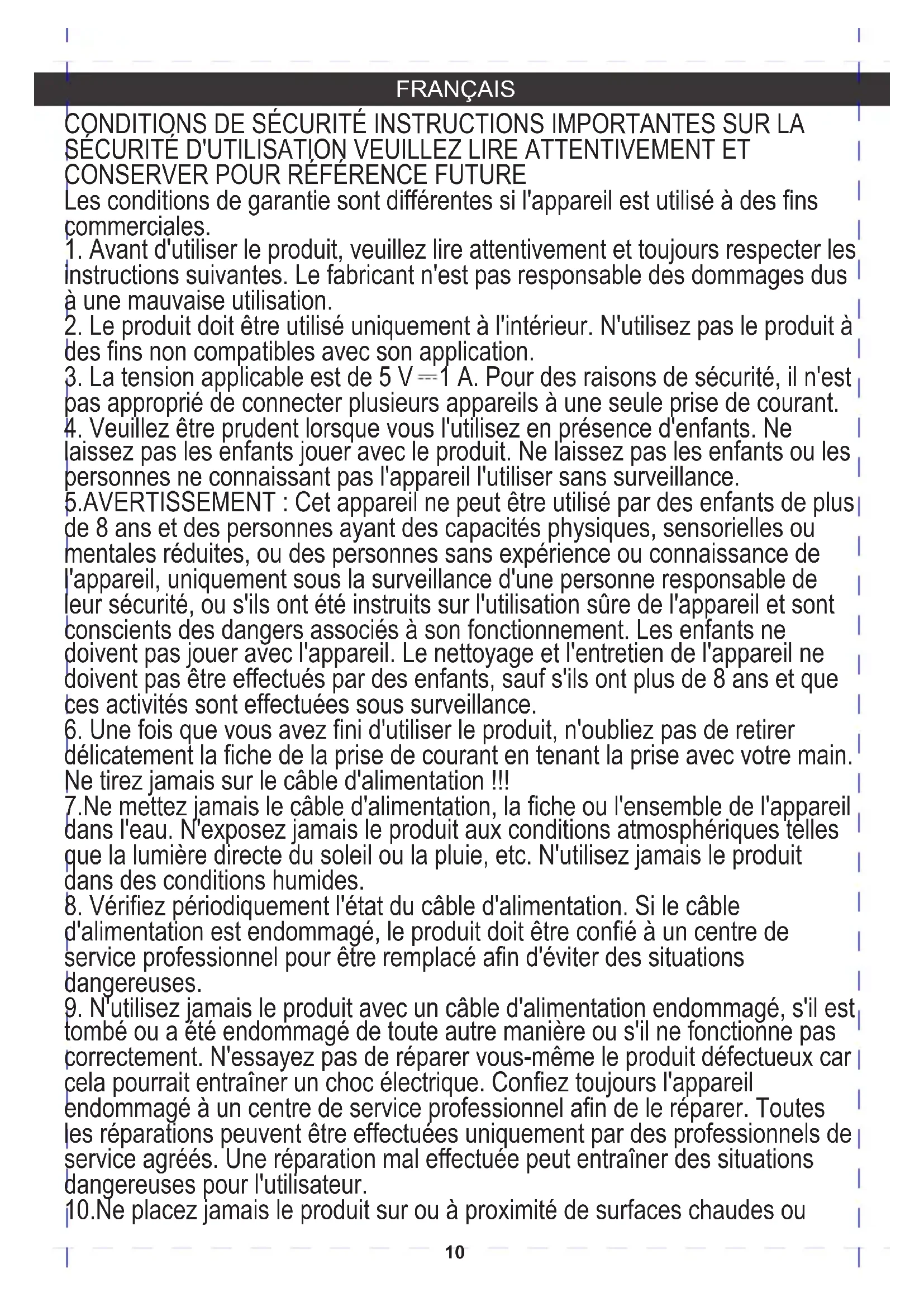 laissez pas les enfants jouer avec le produit. Ne laissez pas les enfants ou les personnes ne connaissant pas l'appareil l'utiliser sans surveillance. 5.AVERTISSEMENT : Cet appareil ne peut être utilisé par des enfants de plus de 8 ans et des personnes ayant des capacités physiques, sensorielles ou mentales réduites, ou des personnes sans expérience ou connaissance de l'appareil, uniquement sous la surveillance d'une personne responsable de leur sécurité, ou s'ils ont été instruits sur l'utilisation sûre de l'appareil et sont conscients des dangers associés à son fonctionnement. Les enfants ne doivent pas jouer avec l'appareil. Le nettoyage et l'entretien de l'appareil ne doivent pas être effectués par des enfants, sauf s'ils ont plus de 8 ans et que ces activités sont effectuées sous surveillance.