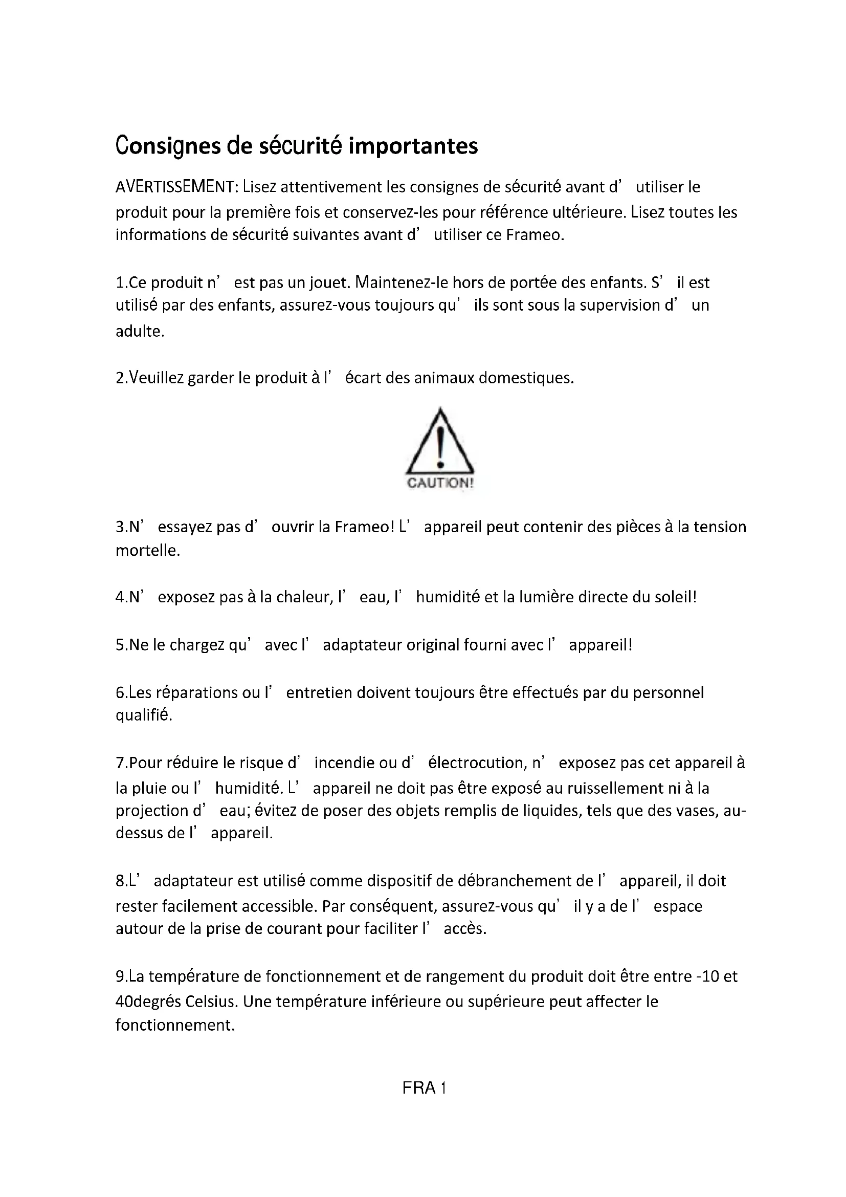 produit pour la première fois et conservez-les pour référence ultérieure. Lisez toutes les informations de sécurité suivantes avant d’utiliser ce Frameo. 1.Ce produit n’est pas un jouet. Maintenez-le hors de portée des enfants. S’il est utilisé par des enfants, assurez-vous toujours qu’ils sont sous la supervision d’un adulte. 2.Veuillez garder le produit à l’écart des animaux domestiques.