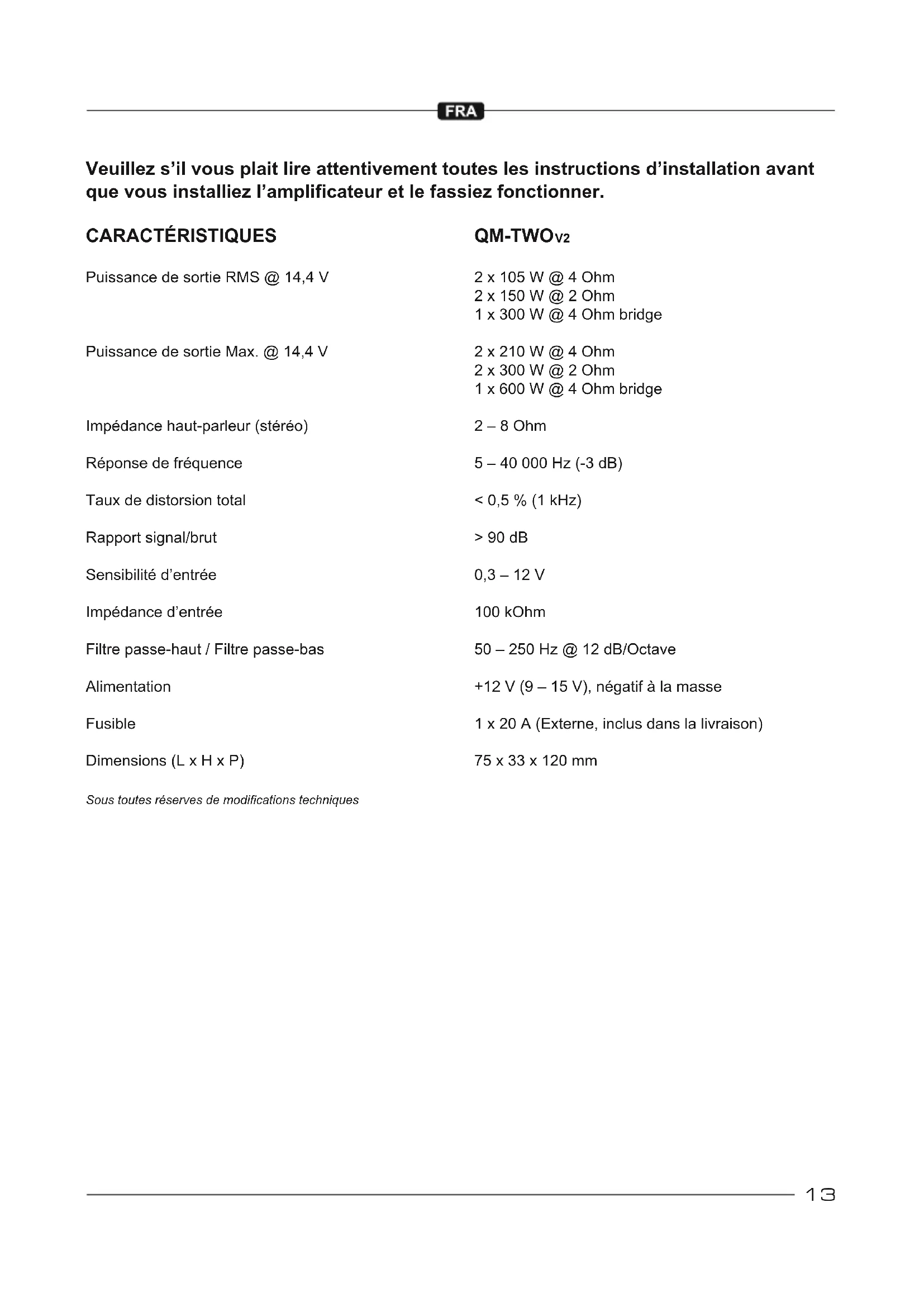 Puissance de sortie RMS @ 14,4 V Puissance de sortie Max. @ 14,4 V Impédance haut-parleur (stéréo) Réponse de fréquence Taux de distorsion total Rapport signal/brut Sensibilité d’entrée Impédance d’entrée Filtre passe-haut / Filtre passe-bas Alimentation Fusible Dimensions (L x H x P) 2 x 105 W @ 4 Ohm 2 x 150 W @ 2 Ohm 1 x 300 W @ 4 Ohm bridge 2 x 210 W @ 4 Ohm 2 x 300 W @ 2 Ohm 1 x 600 W @ 4 Ohm bridge 2 – 8 Ohm 5 – 40 000 Hz (-3 dB) < 0,5 % (1 kHz) > 90 dB 0,3 – 12 V 100 kOhm 50 – 250 Hz @ 12 dB/Octave +12 V (9 – 15 V), négatif à la masse 1 x 20 A (Externe, inclus dans la livraison) 75 x 33 x 120 mm Sous toutes réserves de modications techniques14