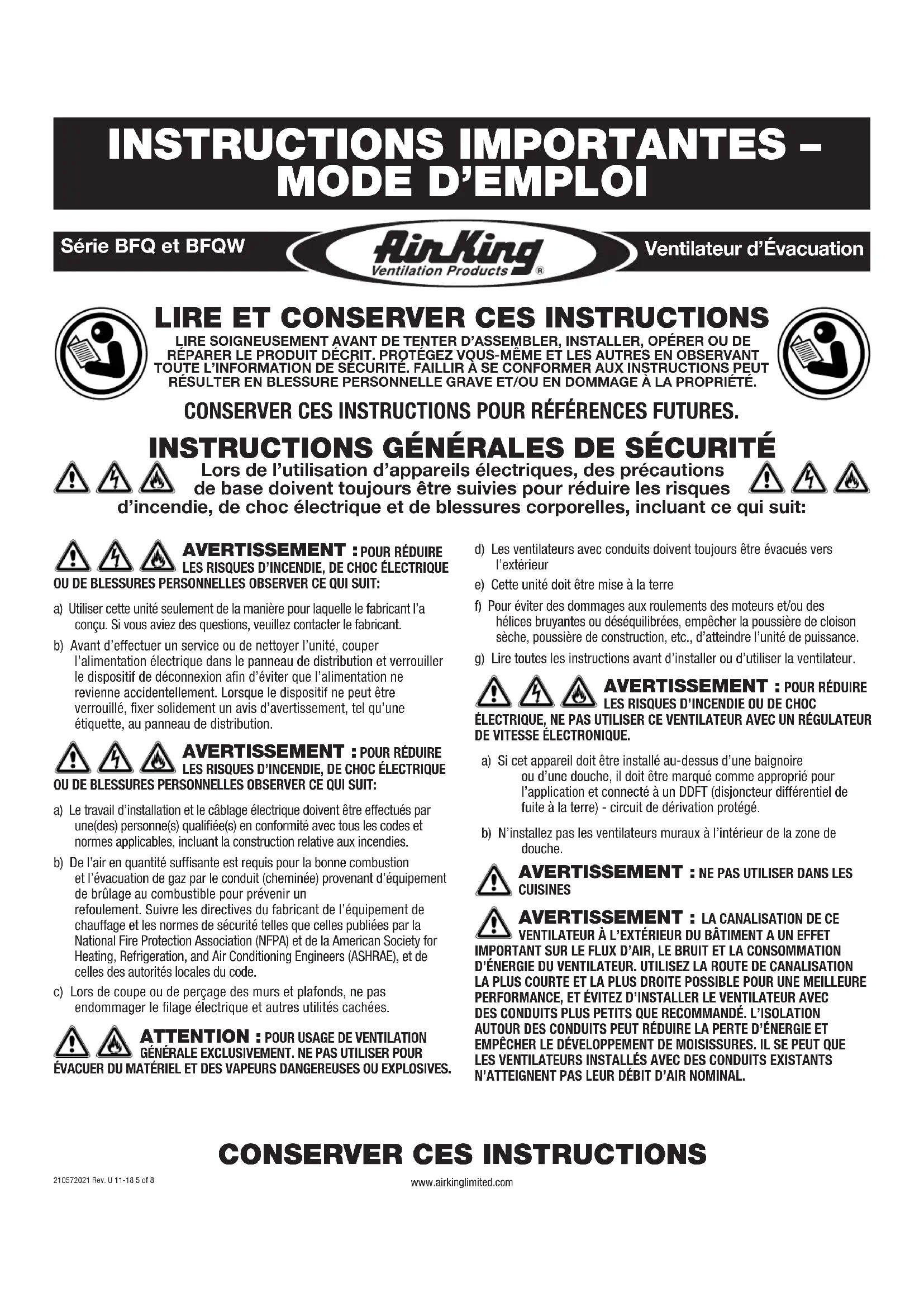QUE FERA AIR KING: Au cours de la période de garantie, Air King, à son choix, réparera ou remplacera n'importe qu'elle partie ou pieces qui s'avent defectueuses ou remplacera le produit entier par le même modele ou un modele comparable.